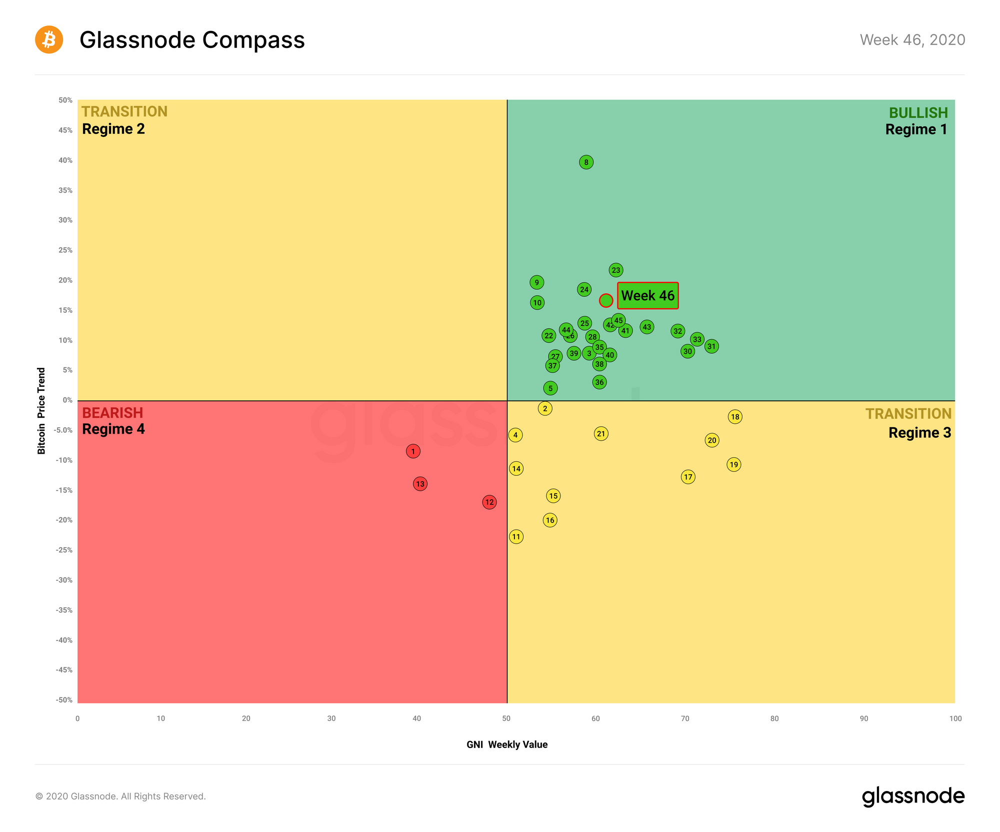 While GNI dropped by one point over the past week, bitcoin's price trend increased to a value of 16% after it rose to exceed $16,000 for the first time since the last major crypto bull market.