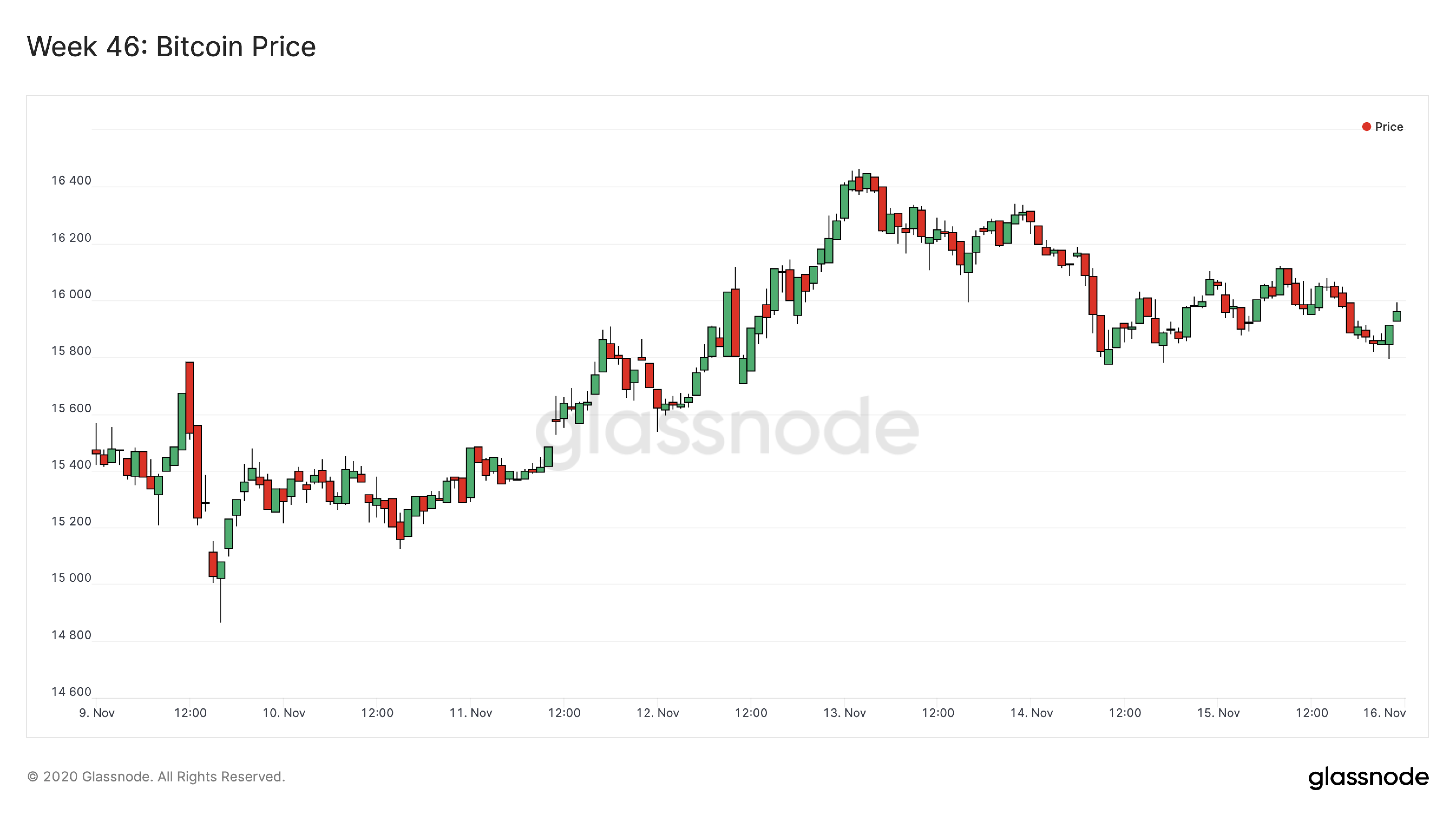 Bitcoin experienced another week of price gains during Week 46, starting the week at $15,500 and ending it at $15,940. On Thursday, it rose above $16,000 for the first time since January 2018. Although it dipped below this point later in the week, as of today, BTC is back above $16k once again.