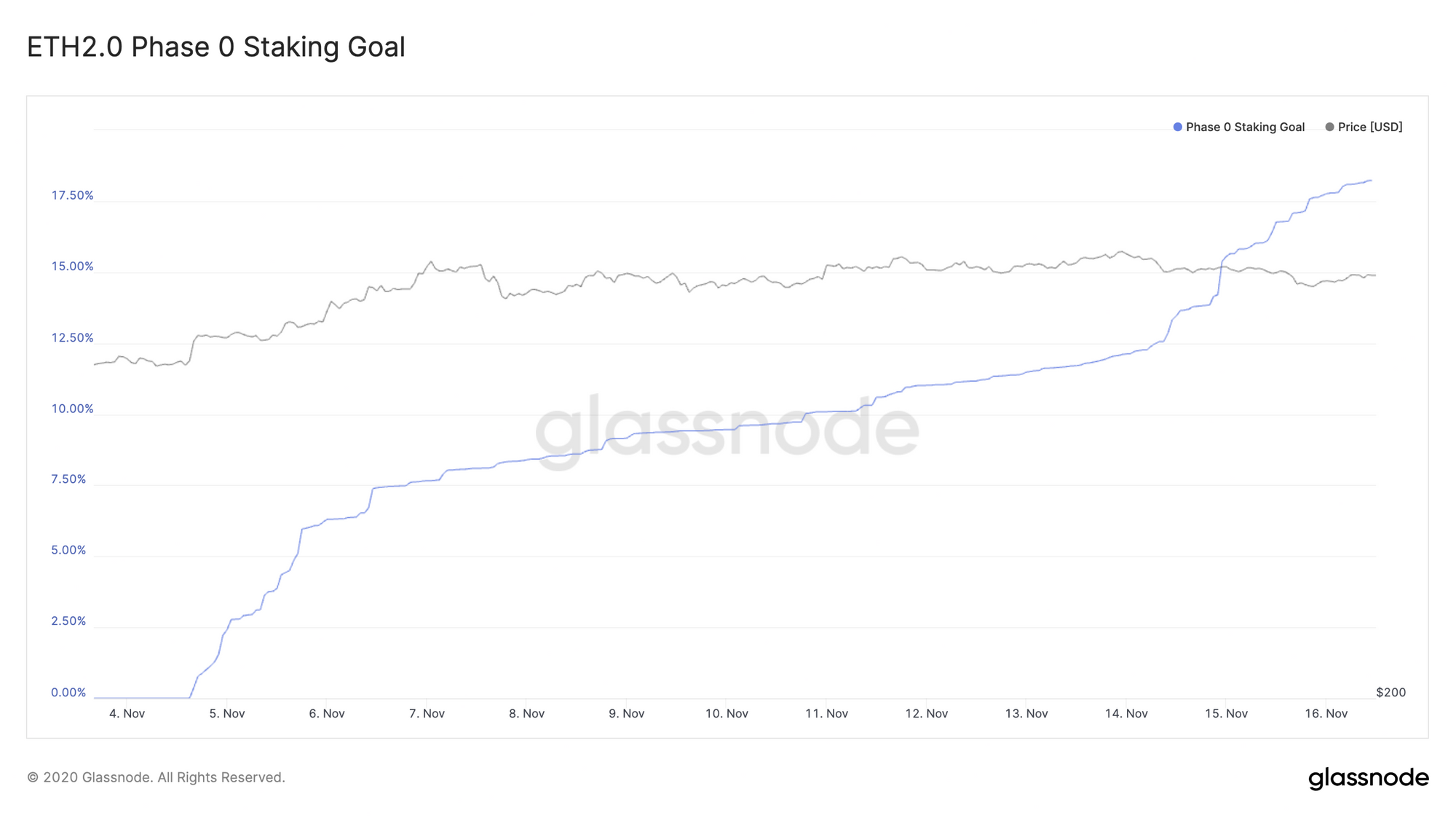 Currently, almost 3000 validators have staked a total of 95,552 ETH in the ETH2.0 contract address. This means that the Ethereum network is over 18% of the way towards reaching the threshold required to launch Phase 0.