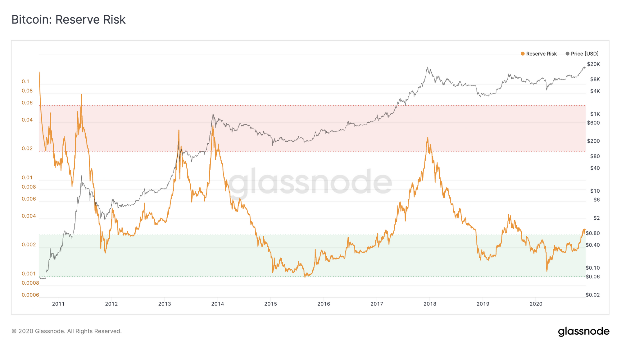 Bitcoin's Reserve Risk is still low, suggesting that the bull market may just be getting started. Reserve Risk is used to assess the confidence of long-term holders relative to the price of BTC; when confidence is high and price is low, Reserve Risk is low, and there is an attractive risk/reward to invest.