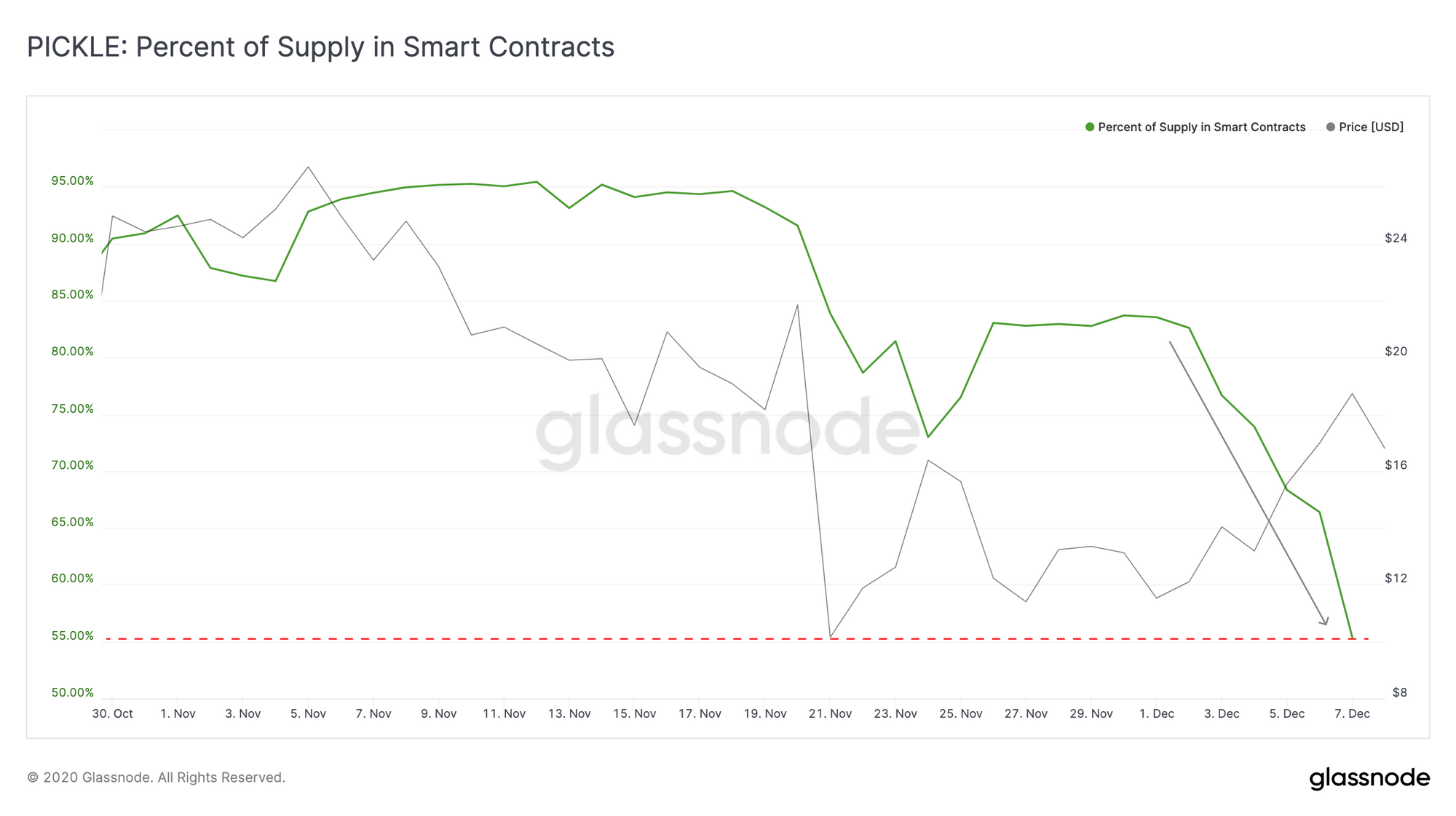 The number of PICKLE tokens being held in smart contracts has been steadily and rapidly decreasing over the past week. The percentage of locked PICKLE has dropped from 82.6% down to 55.4% since 2 December.