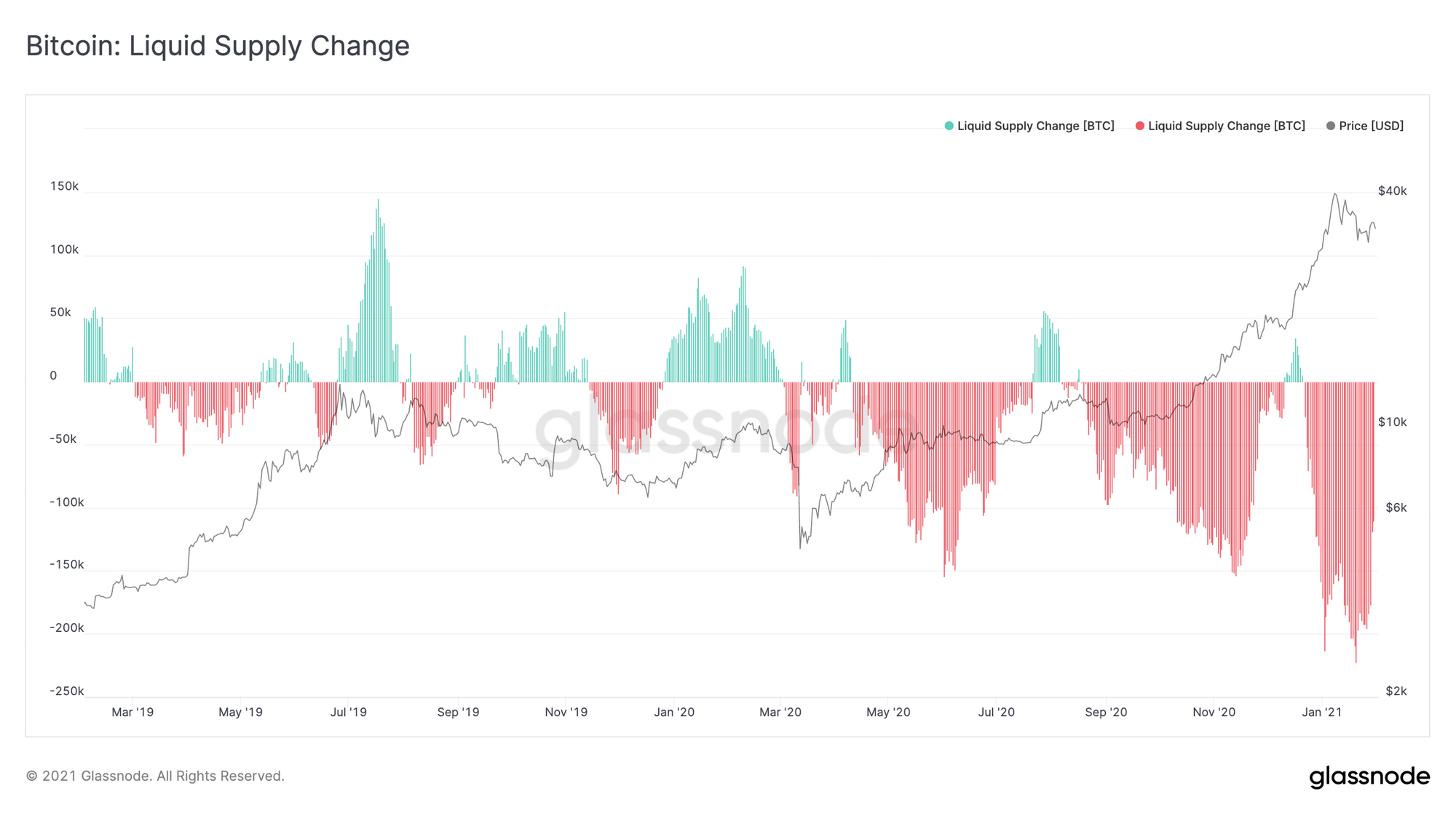 These large investments have been drying up BTC's liquid supply, as seen in the red areas below. 2021 has seen the largest sustained decrease in bitcoin's liquid supply in the history of BTC.