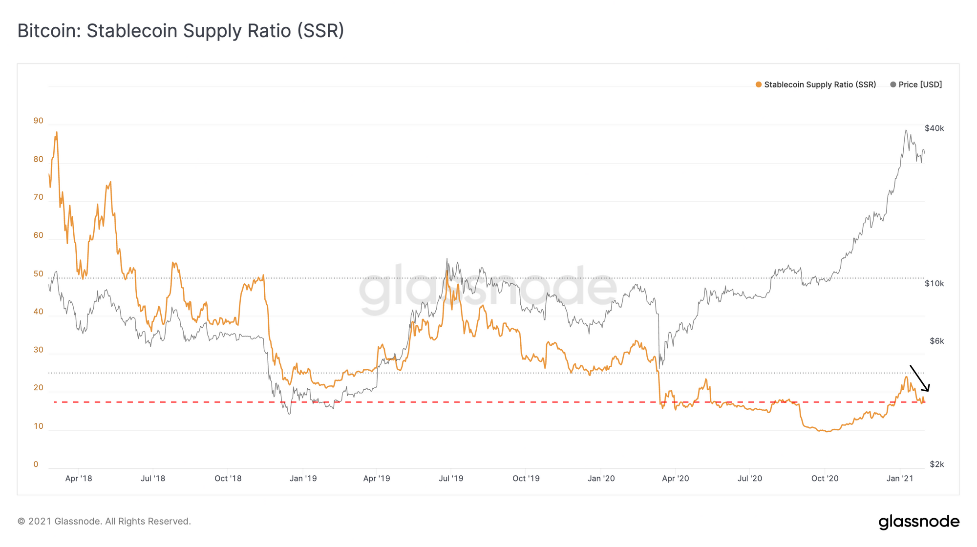 SSR is a ratio of the total value of all bitcoins vs. stablecoins - as such, it decreases when the price of BTC is low or when more stablecoins are entering circulation. The fact that SSR is so low even as BTC maintains high prices demonstrates just how many new stablecoins have entered the ecosystem recently.