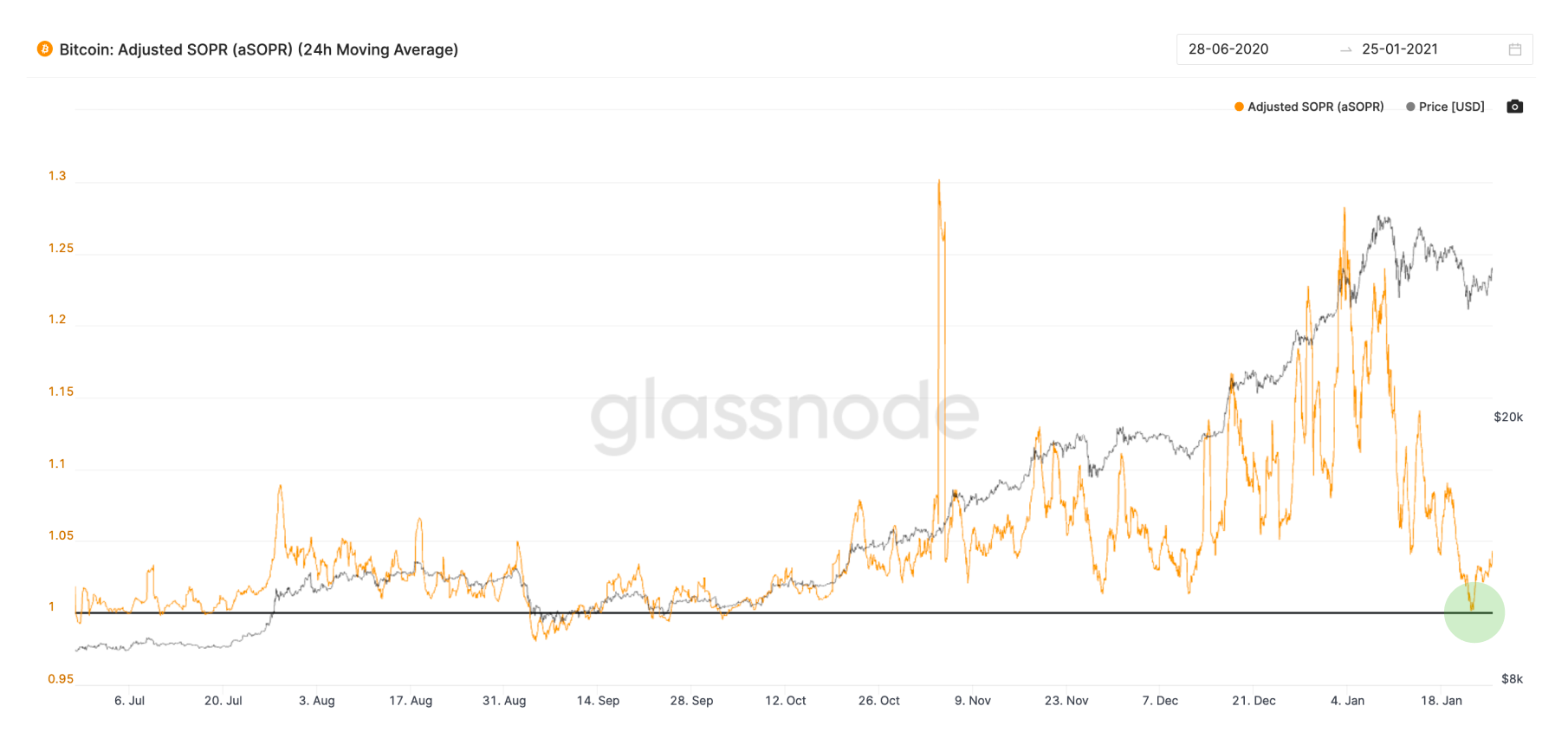 To push SOPR lower, investors would have to be willing to sell at a loss. In order to allow for that, we would need to enter a bearish phase, but this is very unlikely as we are bounded by the $29k price floor.