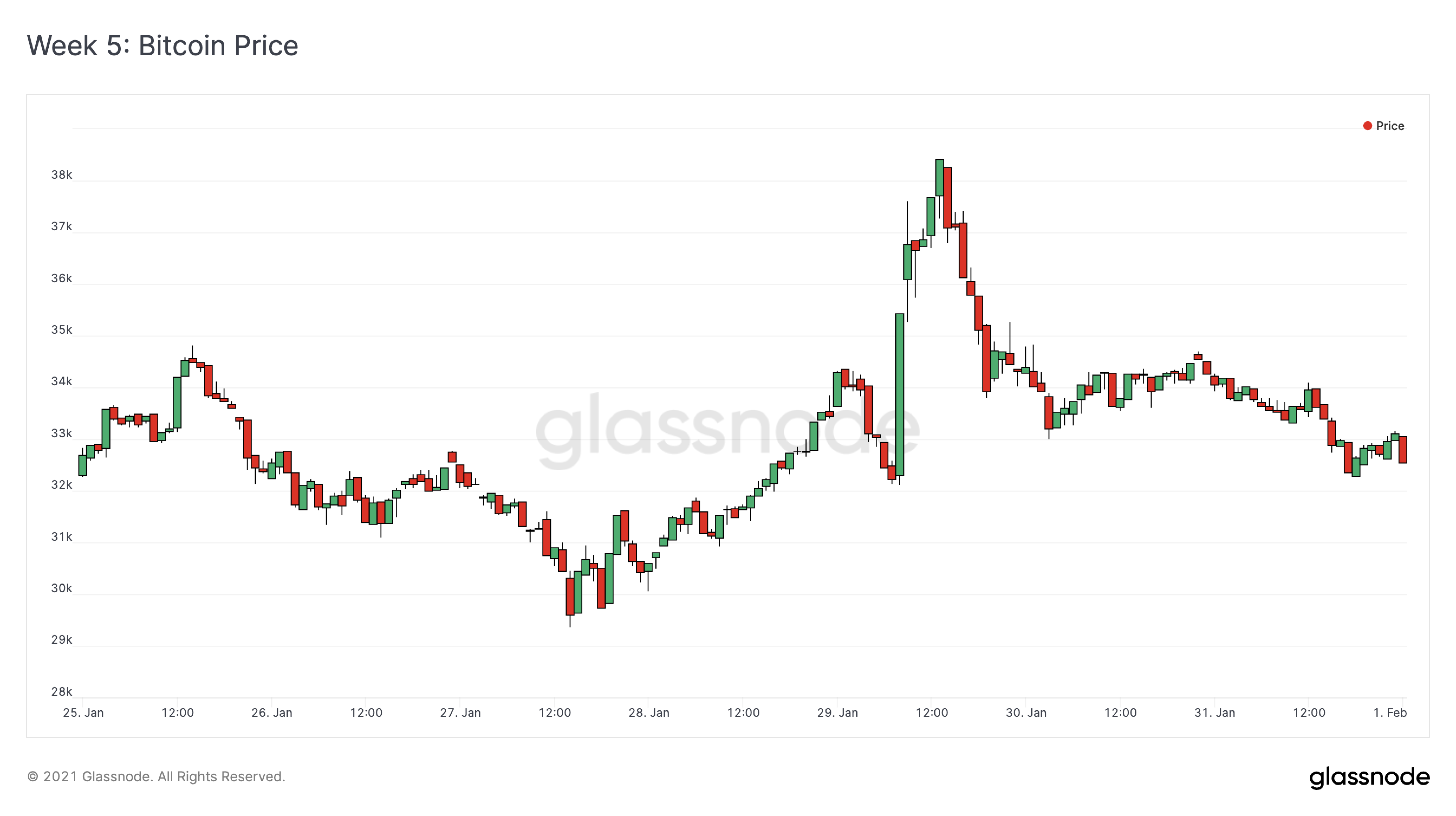 BTC had a relatively stable week, starting out at $32,300 and ending the week at $33,060. On Friday, however, it rapidly shot up to over $38,000, before dropping back down again before the end of the day and slowly declining for the remainder of the week.