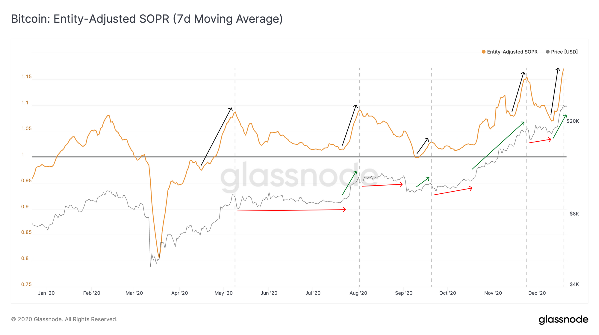 However, in bull markets, similar spikes in SOPR are usually followed by sideways or more gradual upwards price movement before the next acceleration.