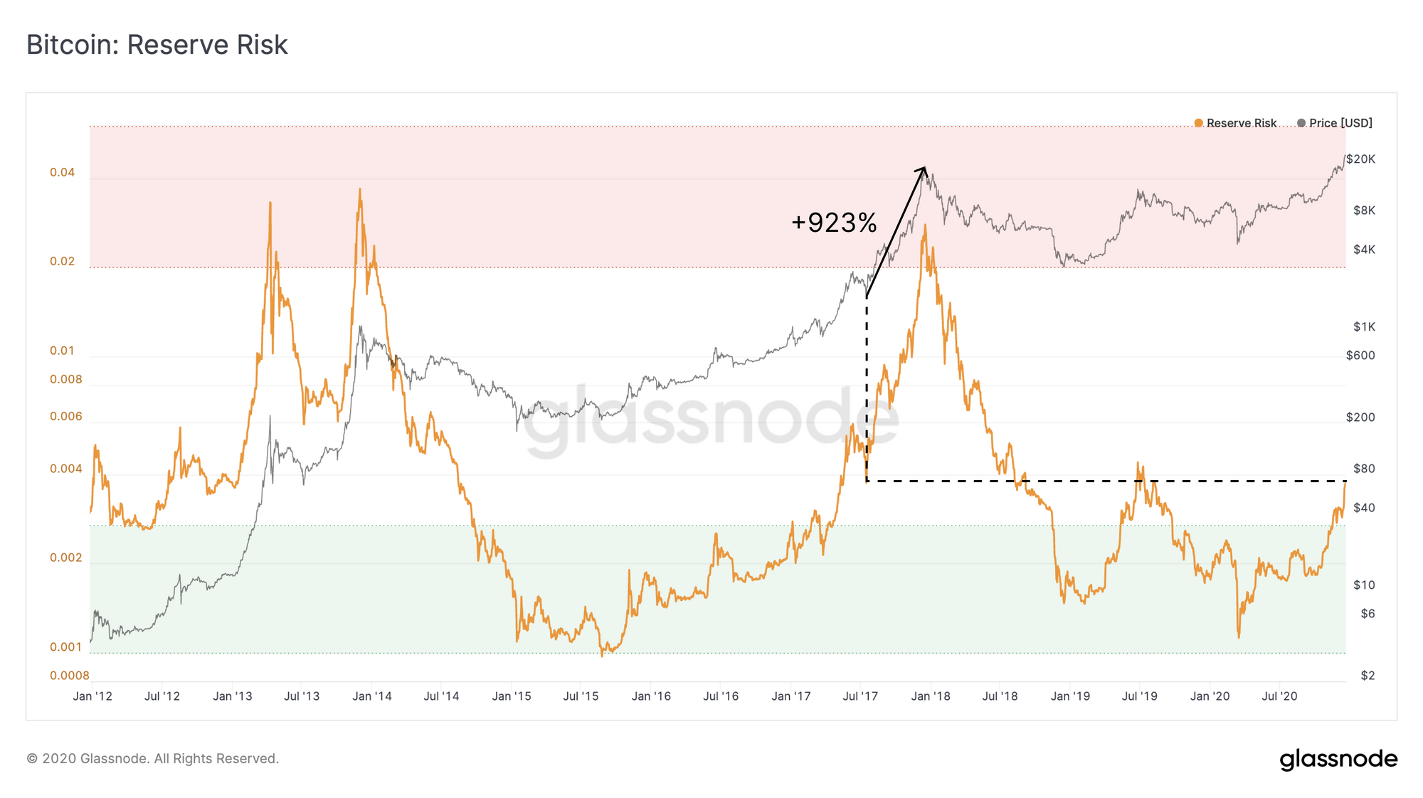 When Reserve Risk was at similarly low levels during the 2017 bull run, the price of bitcoin was still under $2000, and saw a 923% increase before the top. If BTC were to follow this same trend in the current market, it would translate to a market top of almost $220,000.