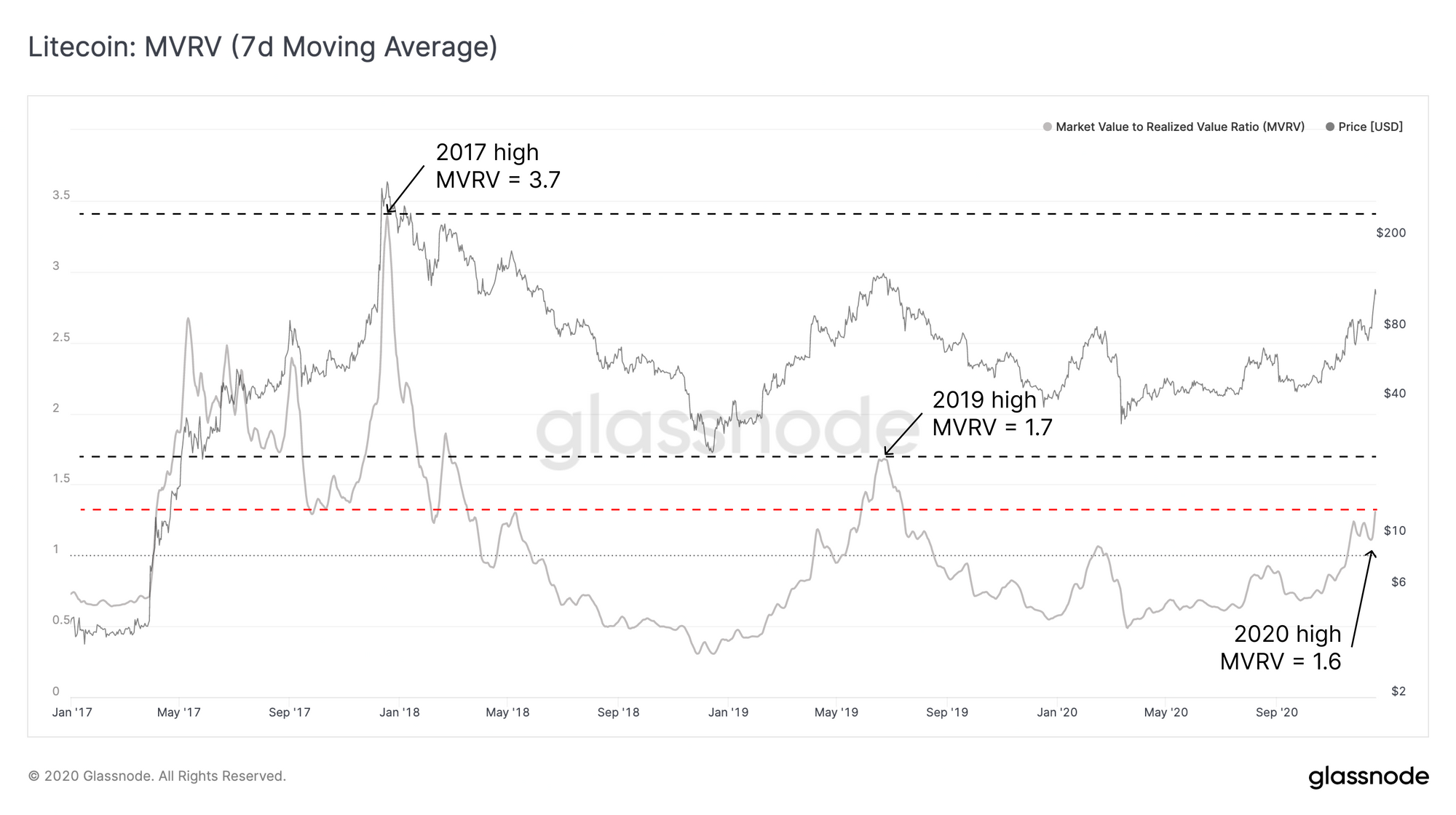 Litecoin's MVRV Ratio is also well below its 2017 high of 3.7, further suggesting that this often underestimated cryptocurrency is well poised to make a comeback.