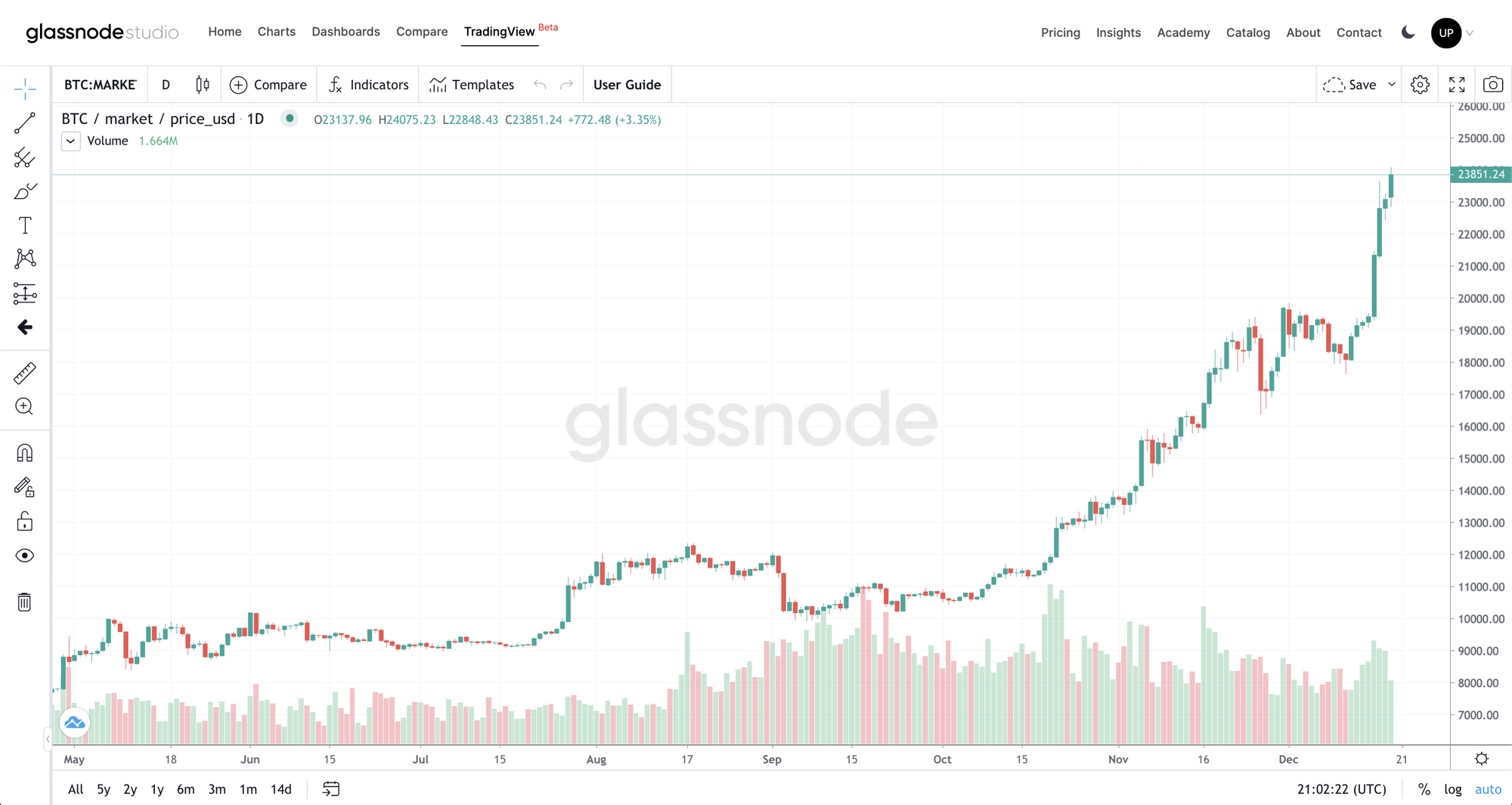 - TradingView Integration (beta) - As requested by our users, we have integrated TradingView into the Glassnode Studio interface! With this new feature, you can now view and compare Glassnode metrics in TradingView's charting environment.