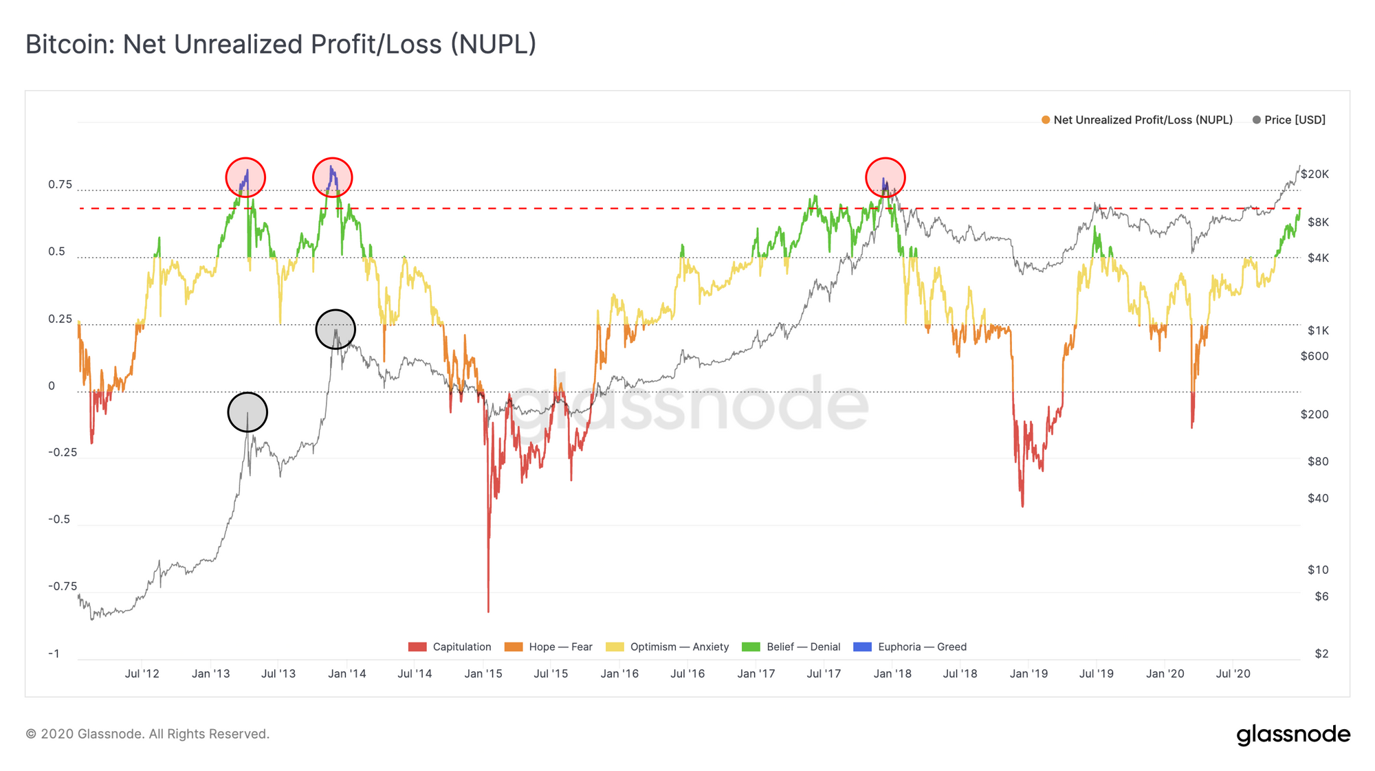 Despite BTC's extreme price gains over the past month, its Net Unrealized Profit/Loss (NUPL) is still relatively low, at a value of 0.67. This means it is still in the green "belief" zone, and hasn't yet reached the blue "euphoria" zone that usually represents market tops.