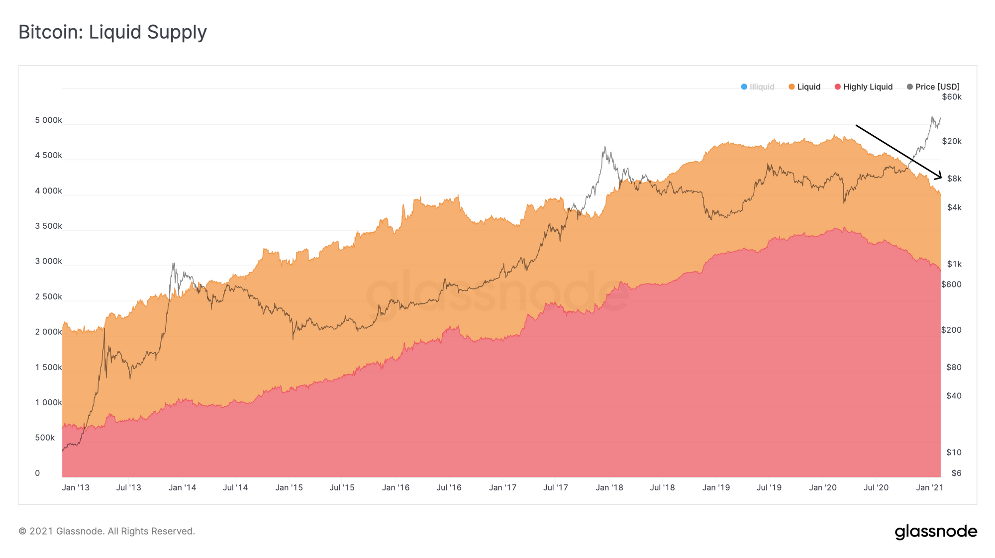 BTC's liquid supply is continuing to decrease as investors increasingly acquire and hodl the asset for the long term. Currently, around 78% of issued bitcoin are either lost or being hodled.
