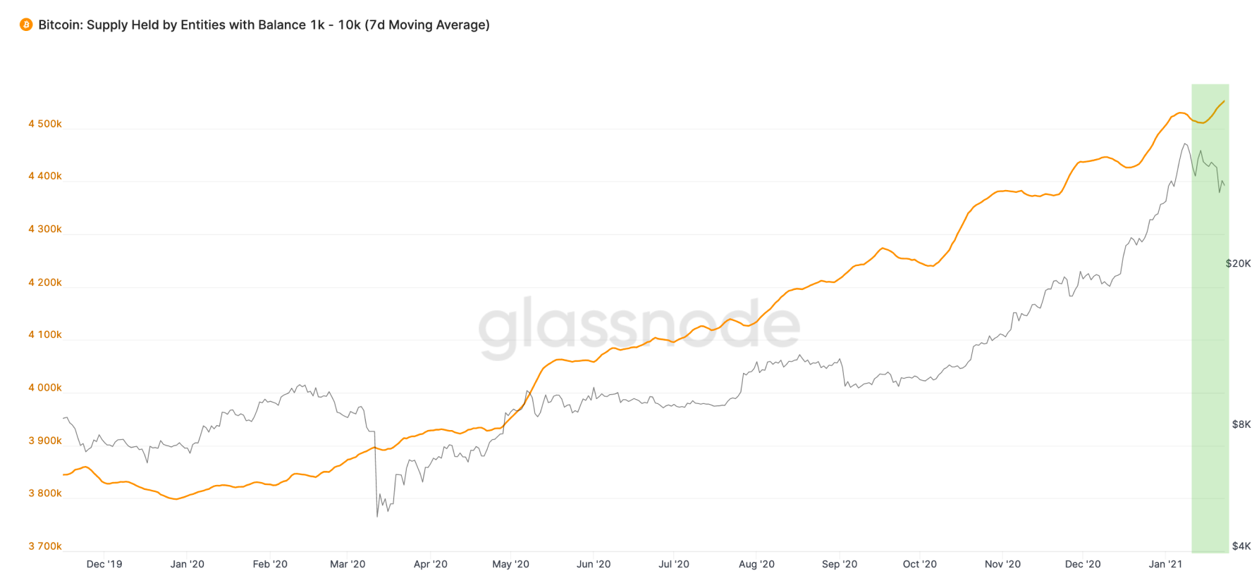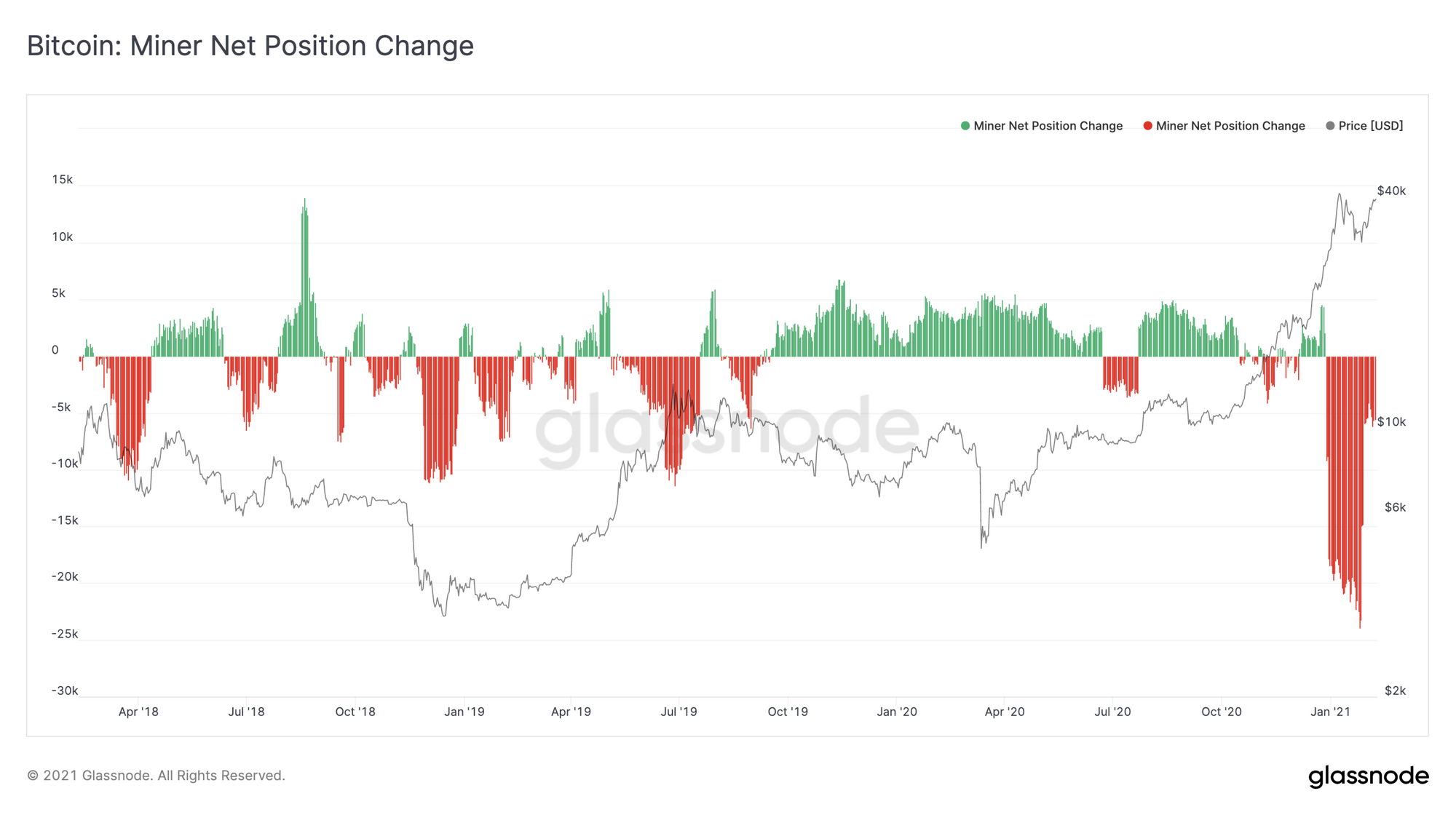 This may appear slightly bearish - however, it comes after a long period of miner accumulation throughout 2020 while the price of BTC was low. As such, it comes across as more of an opportunistic move to cover the previous year's operating costs while the BTC price remains high. Further, it appears to be returning to neutral, suggesting that this selling activity is coming to an end.