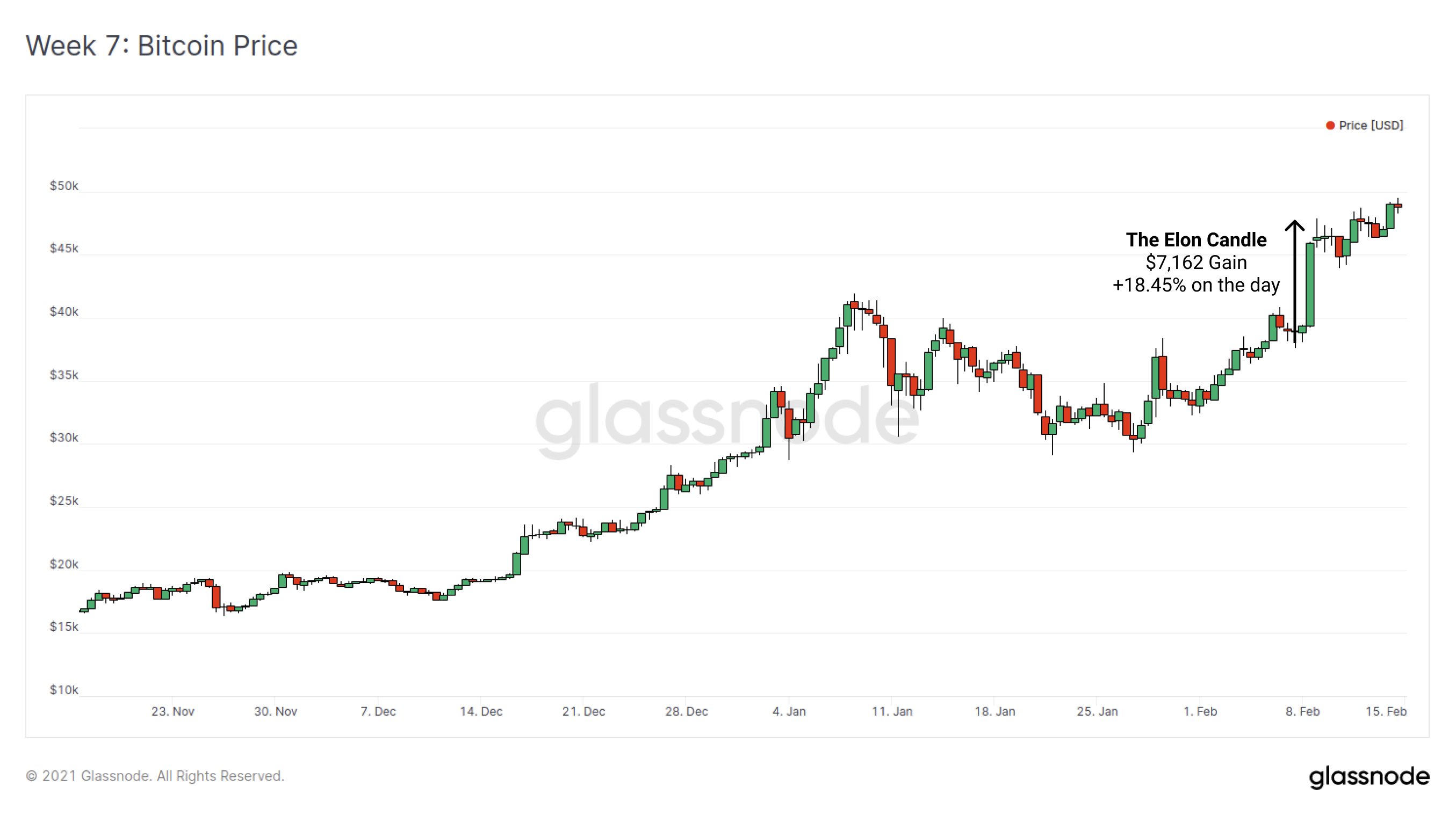 This week, the Bitcoin market opened up to the significant news of Elon Musk's firm Tesla, purchasing $1.5 Billion worth of BTC as part of the companies balance sheet strategy. Immediately following the news, BTC/USD printed the largest daily candle in history, up a staggering $7,162 (+18.45% on the day). The market has lovingly named this the 'Elon Candle'.