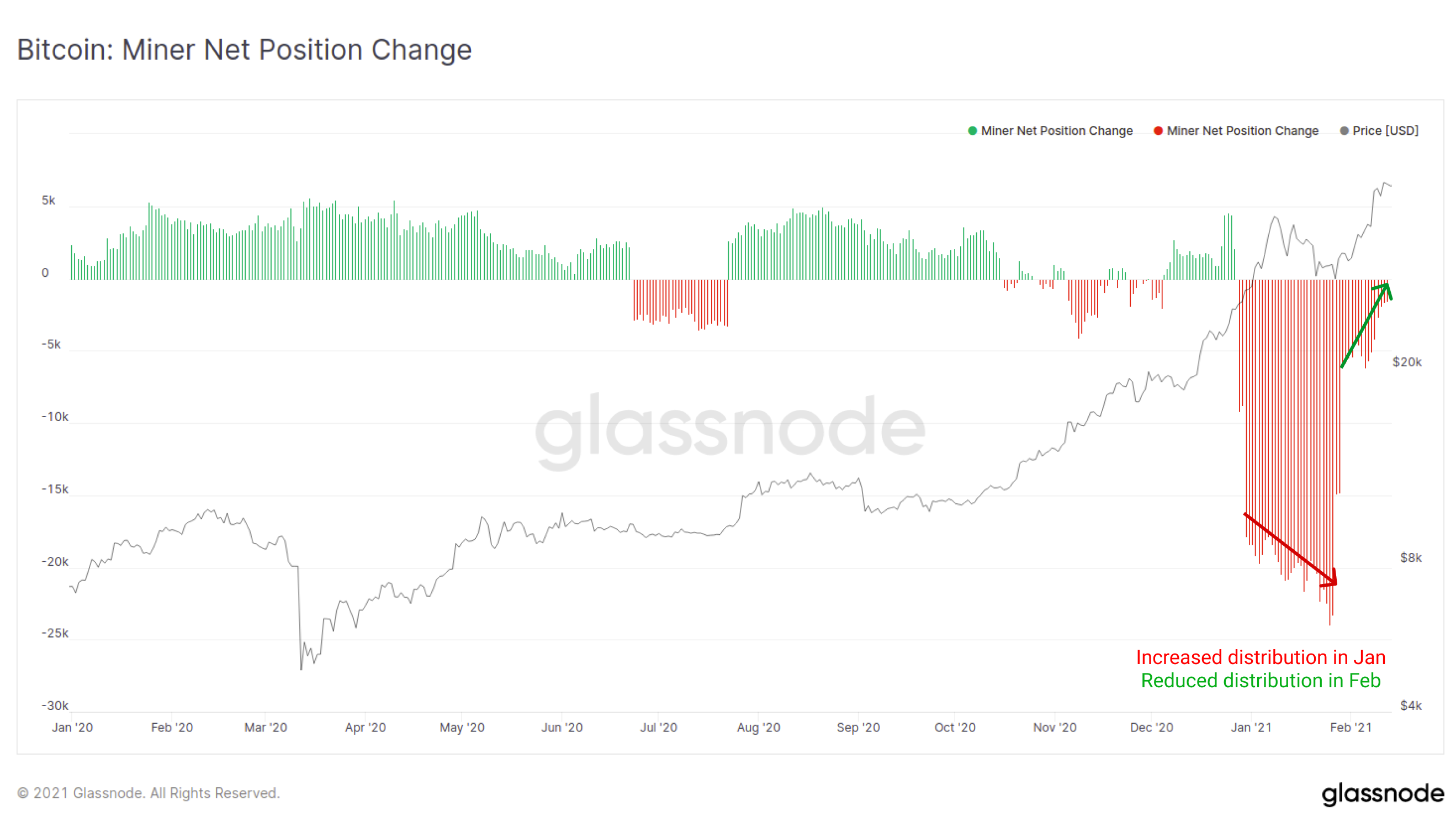 After a period of increased miner distribution during the rally and subsequent consolidation throughout January, miners have actually eased off their sell pressure this week. This suggests that miners have either completed adequate sales to cover costs, or could also mean they see Tesla's vote of confidence as fair reason to keep a strong grip on their treasuries.