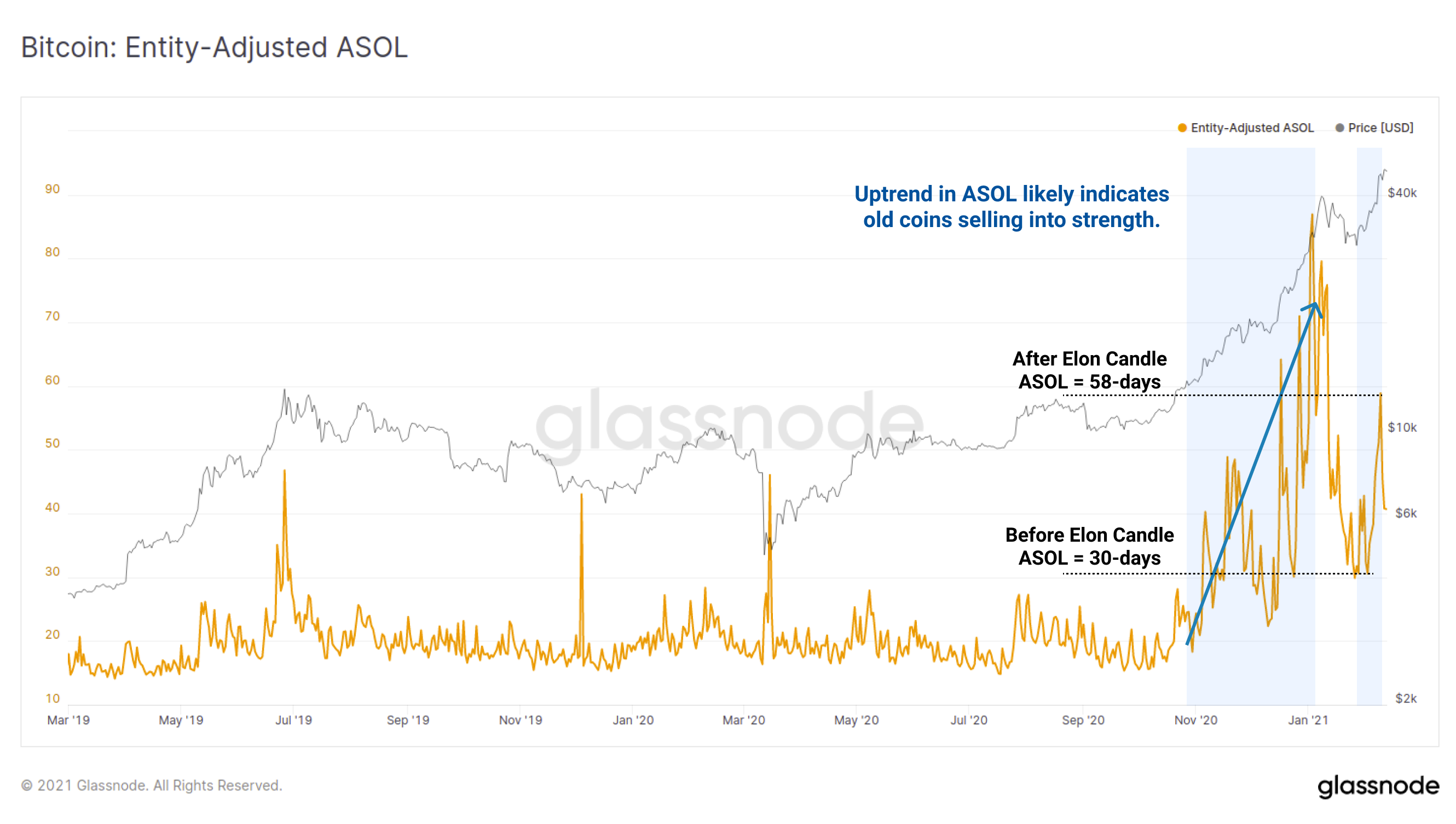 HODLer's of older coins however, appear to have taken advantage of the market strength to move their coins and potentially sell into the move. The Elon Candle has lifted the average age of coins spent from 30-days to 58-days, as shown in the (Average Spent Output Lifespan indicator (ASOL).