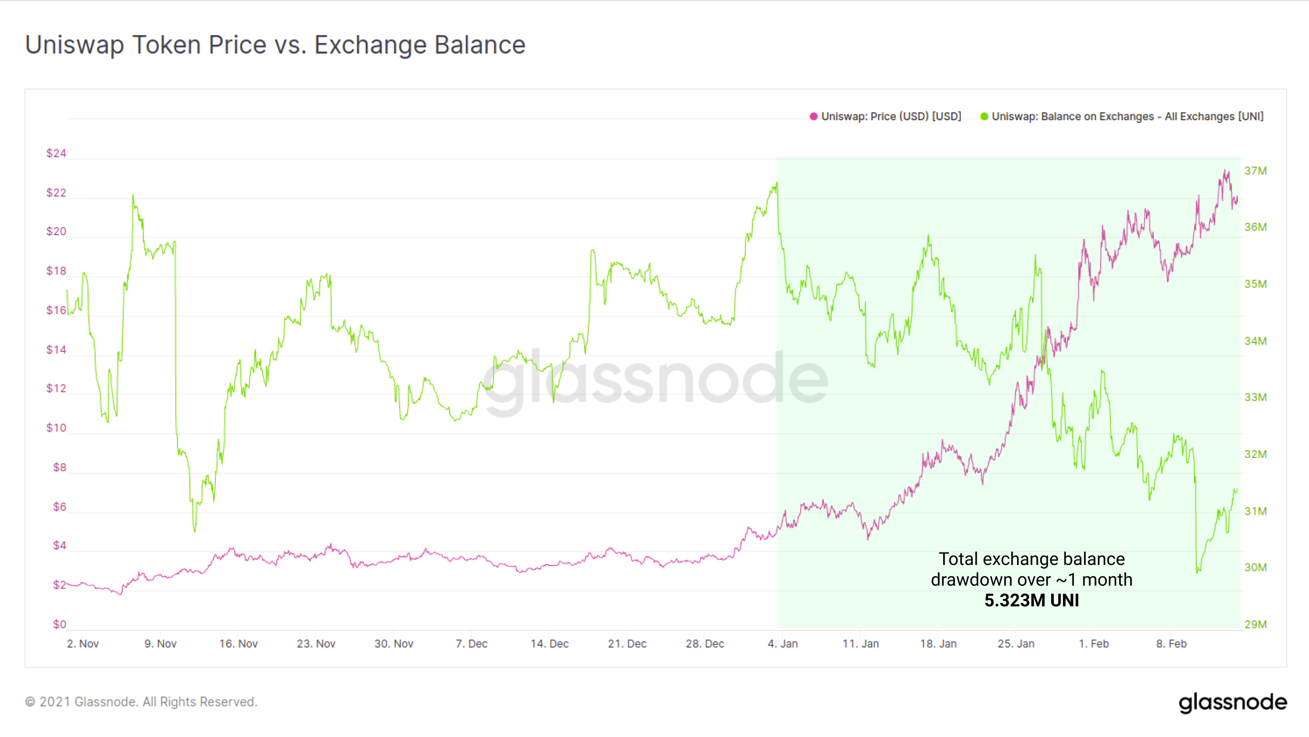 Another asset which has seen significant positive price performance, alongside a drawdown in exchange balances, is the Uniswap Token (UNI). After exchange balances peaked at 36.86M UNI in early January, a 10% outflow of 5.323M UNI tokens has occurred, supporting a price rally from $6.33 to over $23.26 (a 367% gain).