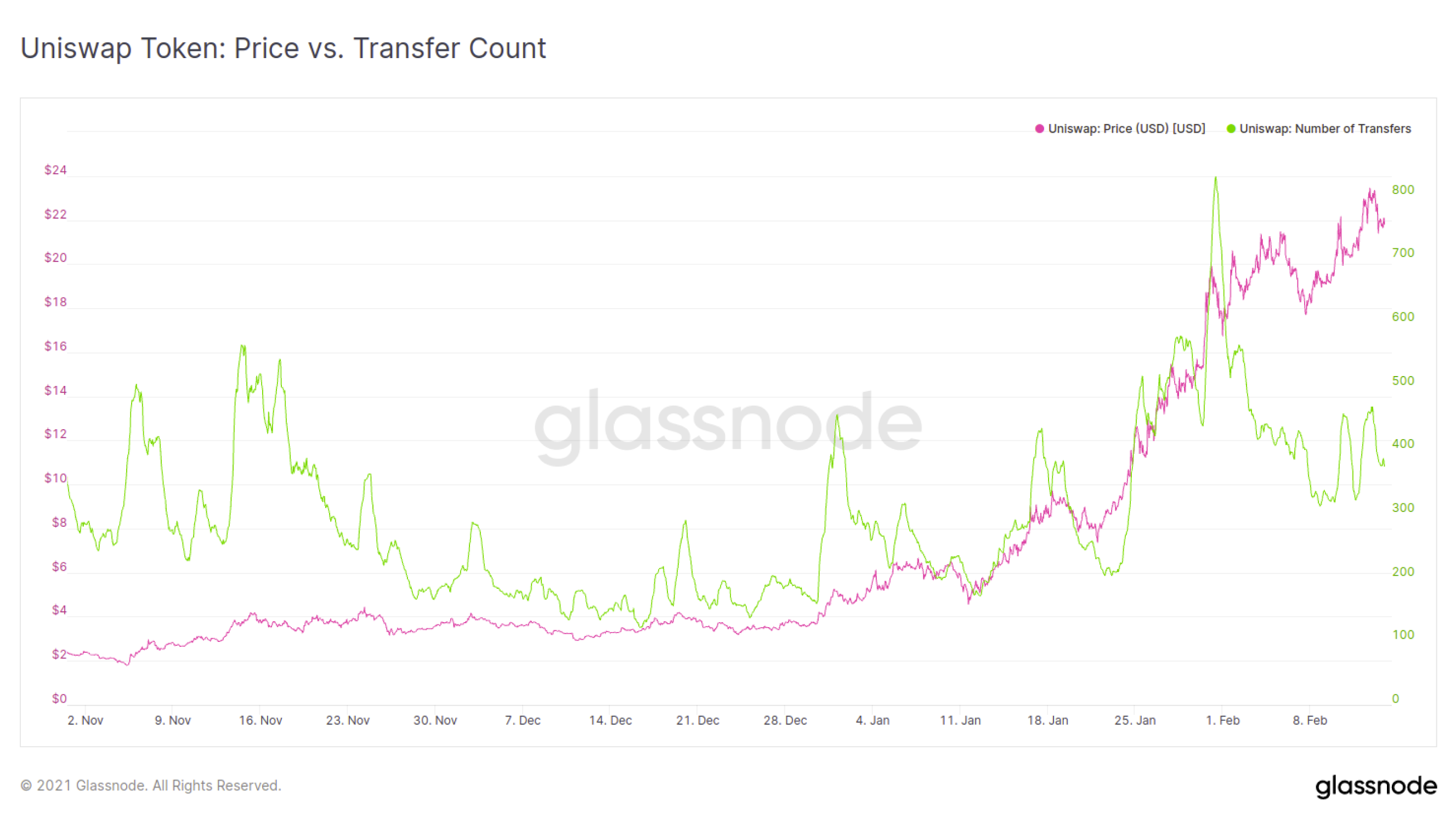 Over this same period of time, the number of intra-day transactions transferring UNI tokens tripled from 277tx/hr to a peak of 830tx/hr. Since the 1-Feb however there has been a marked slow-down of transactions counts for UNI tokens despite continued price appreciation.