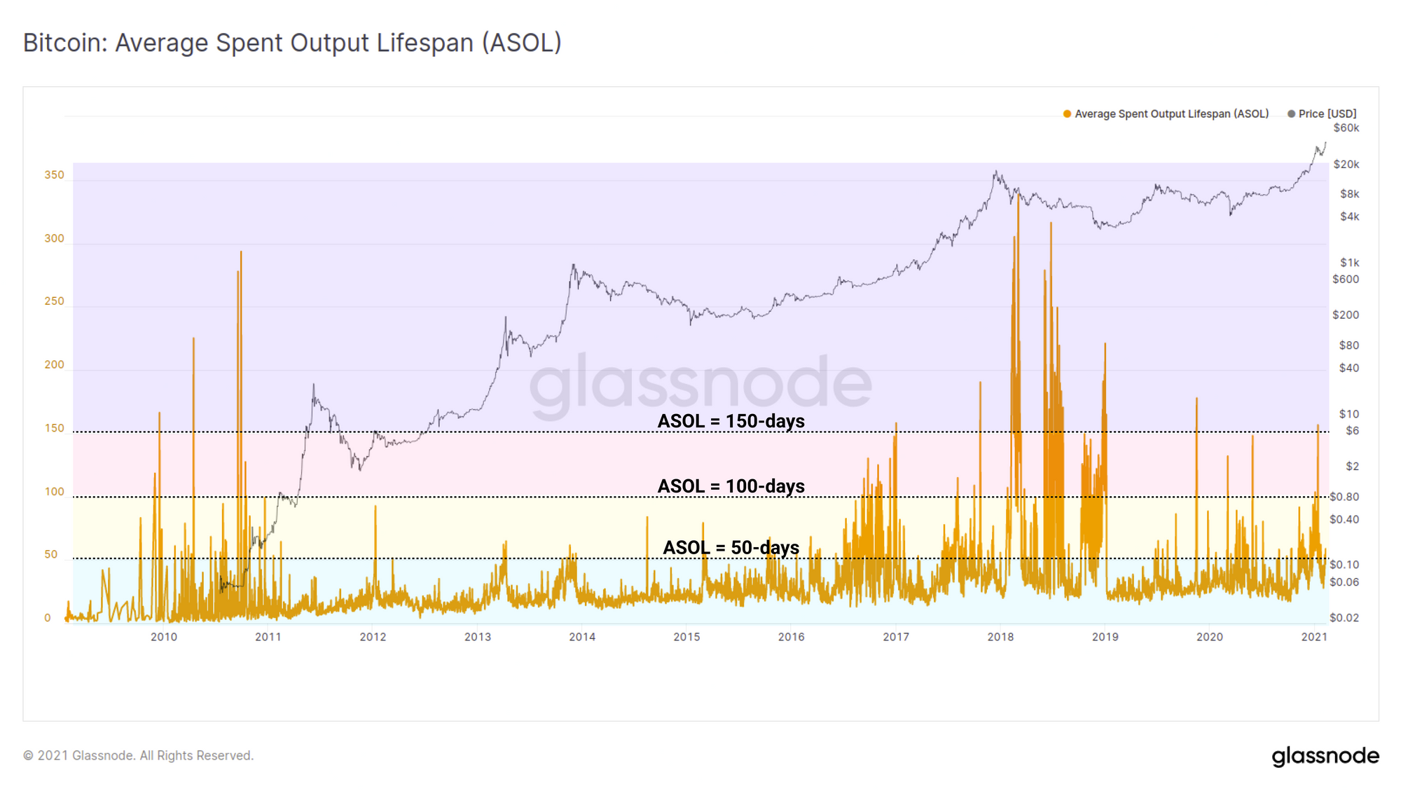 - An ASOL value of 50-days however, means there were a reasonable number of old coins spent to lift the average. Perhaps a small few ancient coins (> 3yr old) moved, or it could represent be a larger volume of coins bought 1-3yrs ago in the last bear market.