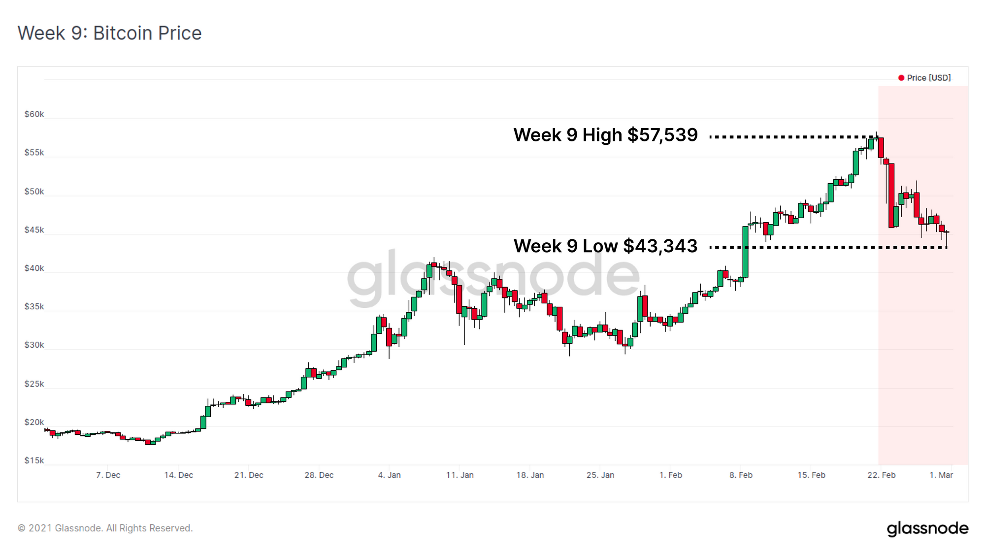 This week, the Bitcoin market has commenced it's second notable correction since breaking the $20k all-time-high. The week opened with a price high of $57,539 and before trending into an inta-day low of $43,343, representing a 25% correction.