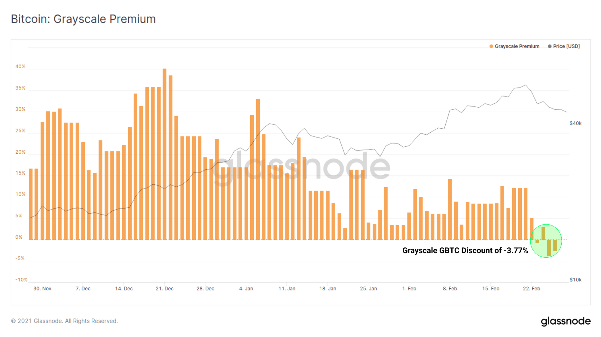 The Grayscale 'premium' has, for the first time, become a Grayscale 'discount', hitting a low of -3.77%. Whilst this price correction is a key driving force, the market is also starting to see the introduction of competitor ETF style products such as Canada's Purpose ETF (Glassnode dashboard available here).