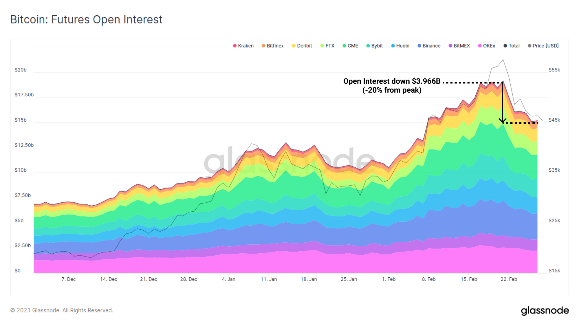 Futures open interest dropped almost $4 Billion from the peak of $18.4 Billion this week, a reduction of 21.7%.