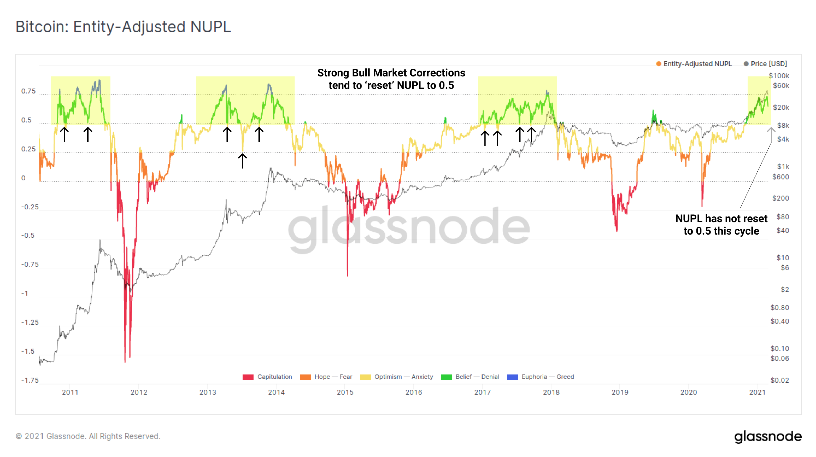 As a demonstration of how powerful this bull market has been, the Net Unrealized Profit and Loss (NUPL) metric has not reset to it's typical bull market support value of 0.5 so far. Previous cycles have seen 'choppy' sideways action for NUPL as we move into the second half of the bull. NUPL value of 0.5 tends to act as a key buy the dip level where the market is in an aggregate profit of 50% of the market cap.