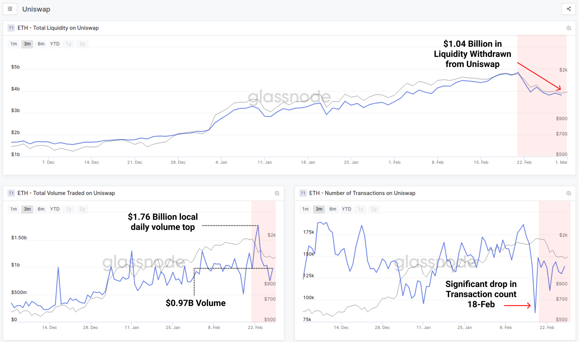 This week $1.04 Billion in liquidity was withdrawn from Uniswap which appears to be spread across an variety of assets. Uniswap transaction counts fell significantly from ~186k to 85k tx/day on 18-Feb, approximately signalling the local top in ETH/USD price. Uniswap transaction volume then surged to $1.76 Billion on 23-Feb before dropping 45% to $0.97 Billion by weeks end.