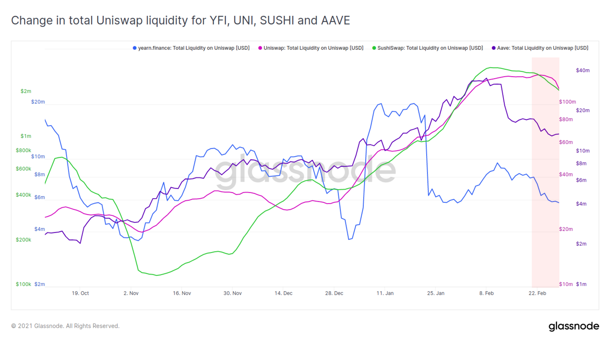 Liquidity withdrawals from Uniswap can be seen across four major DeFi assets as examples: YFI, UNI, SUSHI and AAVE all saw liquidity reserves fall by around 20% to 30% this week.