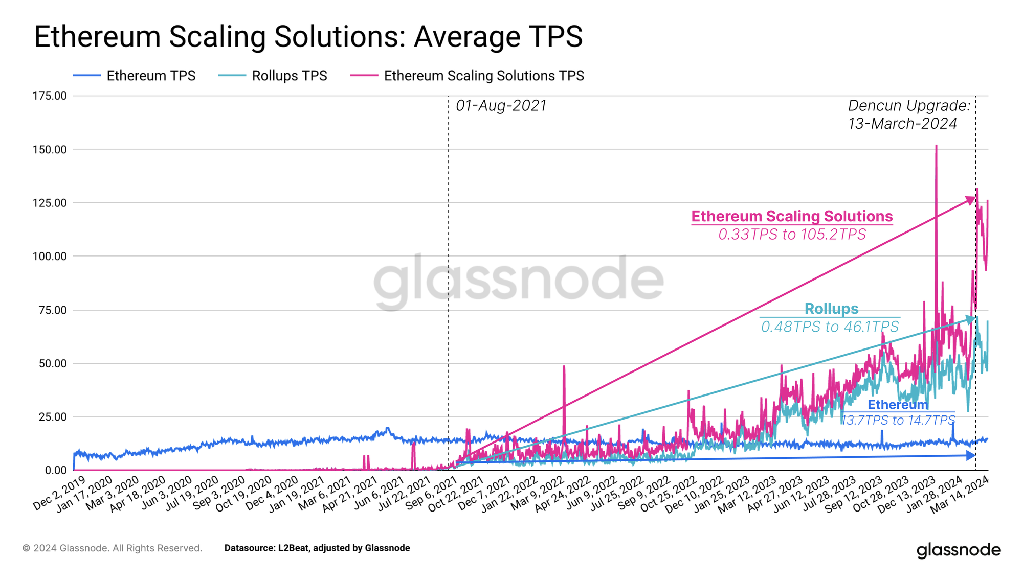 Shortly after the introduction of the first set of scaling solutions for Ethereum, we observed an increase in average transaction throughput in mid-2021 was 105 Transactions per Second (TPS). Of this, roll-ups accounted for around 46 TPS, or 44% of the total.