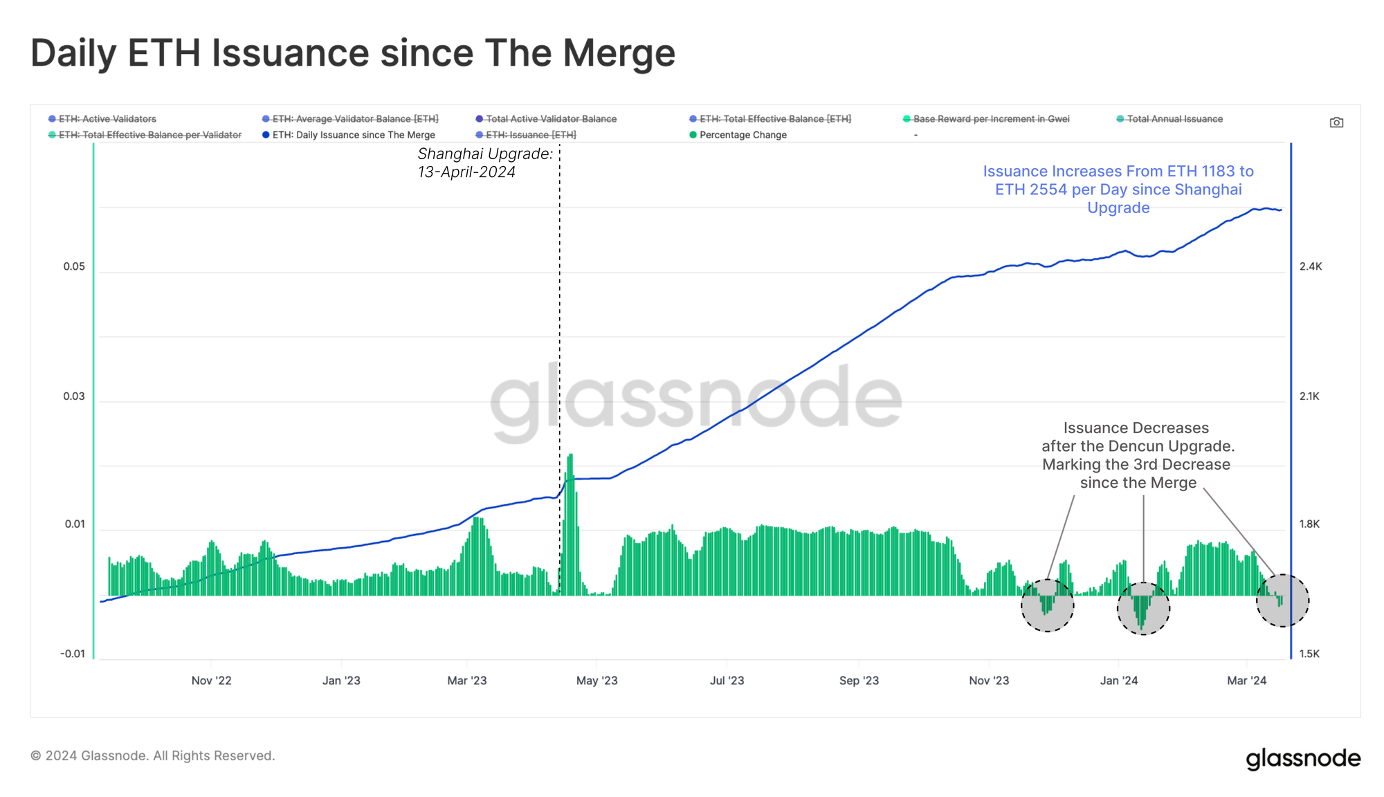 Since the Shanghai Upgrade, the issuance increased from ETH 1183/day to ETH 2554/day as the validator set grew. Whilst early, we have seen issuance rates decrease for the third time shortly after the Dencun upgrade.
