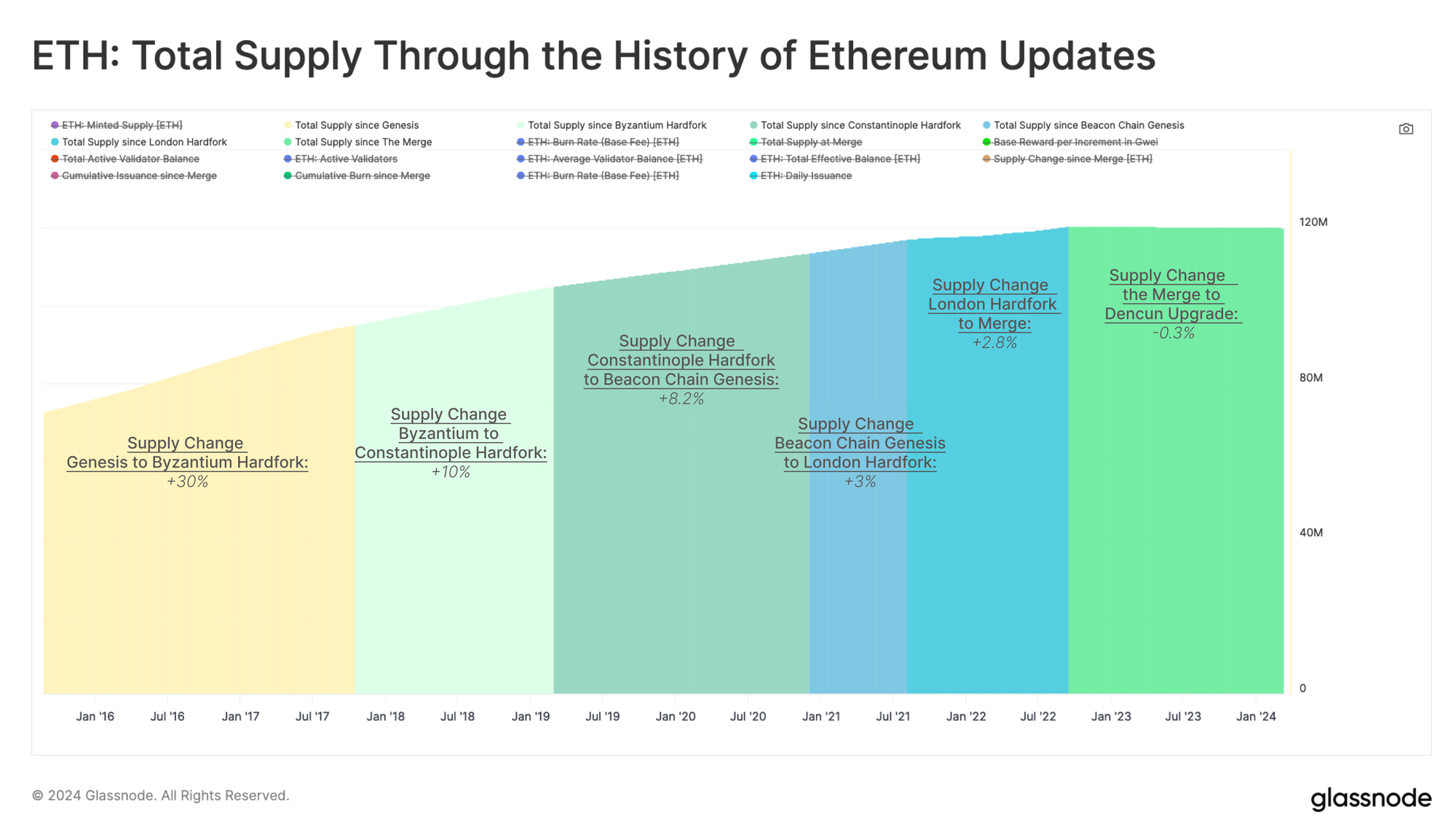 Throughout its history, Ethereum has undergone six major updates, not all of which have directly targeted a change to the ETH supply. However, it's apparent from the last four upgrades that the growth of the ETH supply has slowed. After the Merge, it has even turned slightly negative. The chart below shows these different upgrade events alongside the relative change in the circulating supply of ETH.