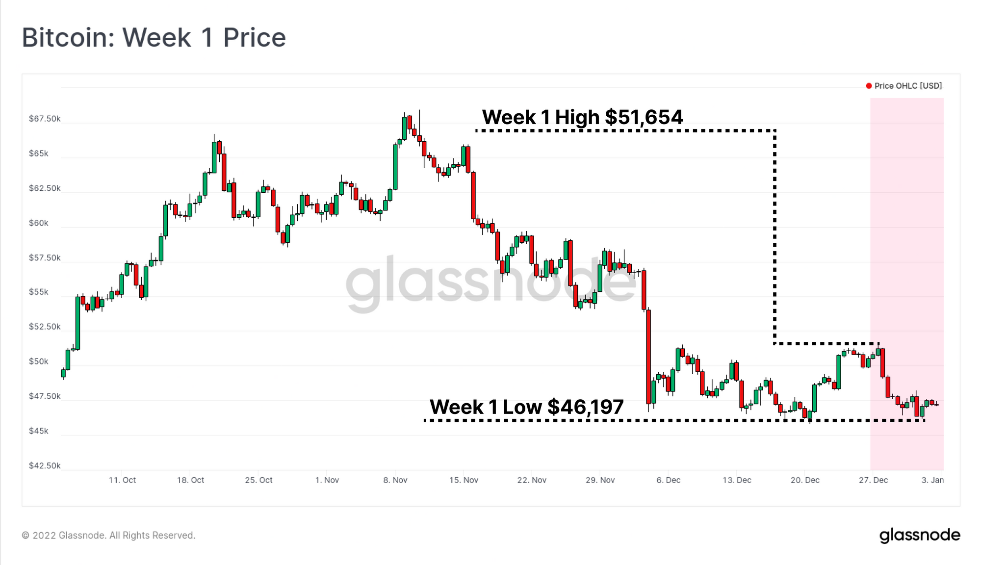 As 2021 wound down, so too did activity in the Bitcoin market, with trading volumes softening, and prices trading more or less sideways. Price has continued to trade in the same range since late November, bouncing between a high of $51,654, and a low of $46,197 this week.
