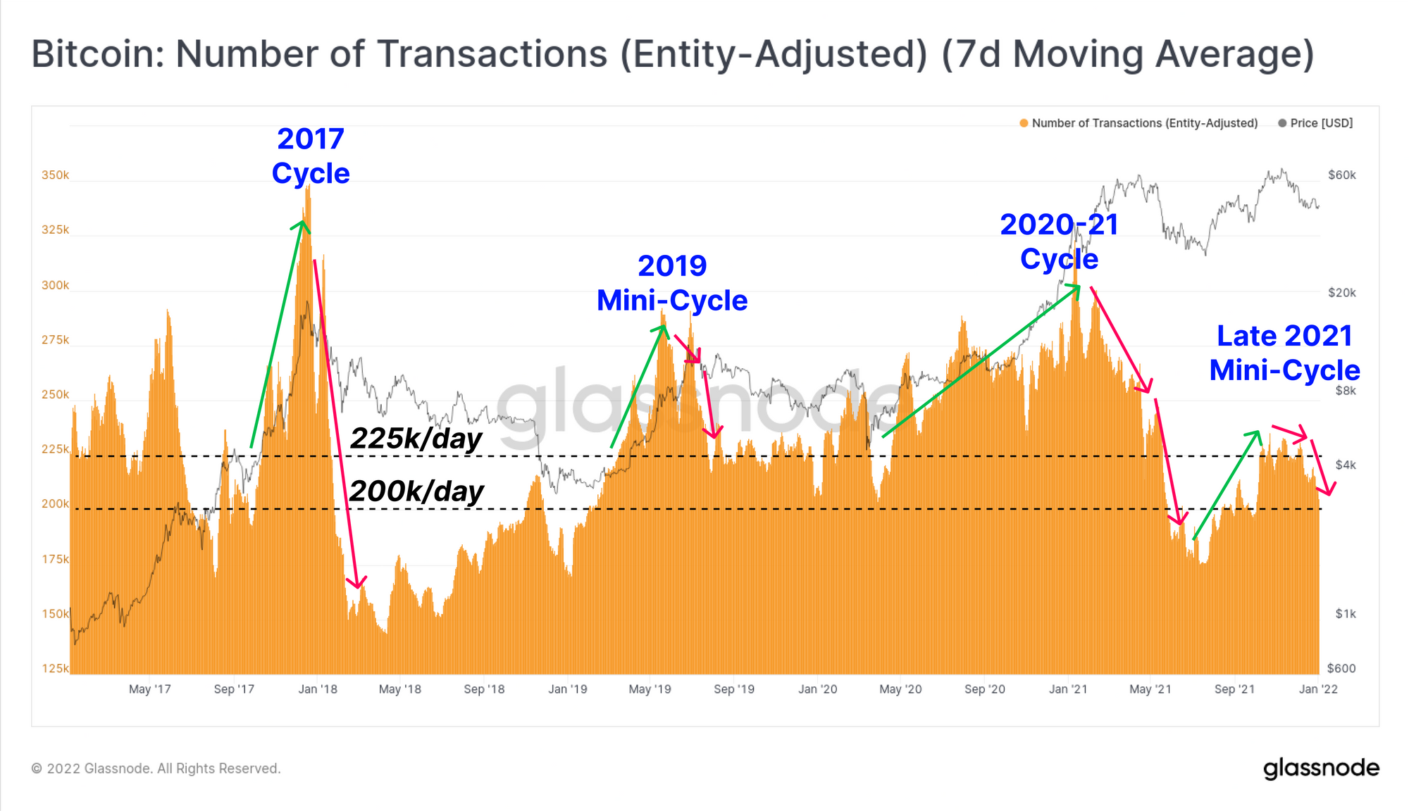 Transaction counts paint a similar picture, where the bull markets of 2017 and 2020-21 stand out clearly, hitting over 300k transactions per day at the peaks. Again similarities can be found between April-August 2019 and the current market since September 2021. In both cases, an initial burst of activity supported rallying prices, but failed to sustain any meaningful momentum, with both transaction counts and prices rolling over.