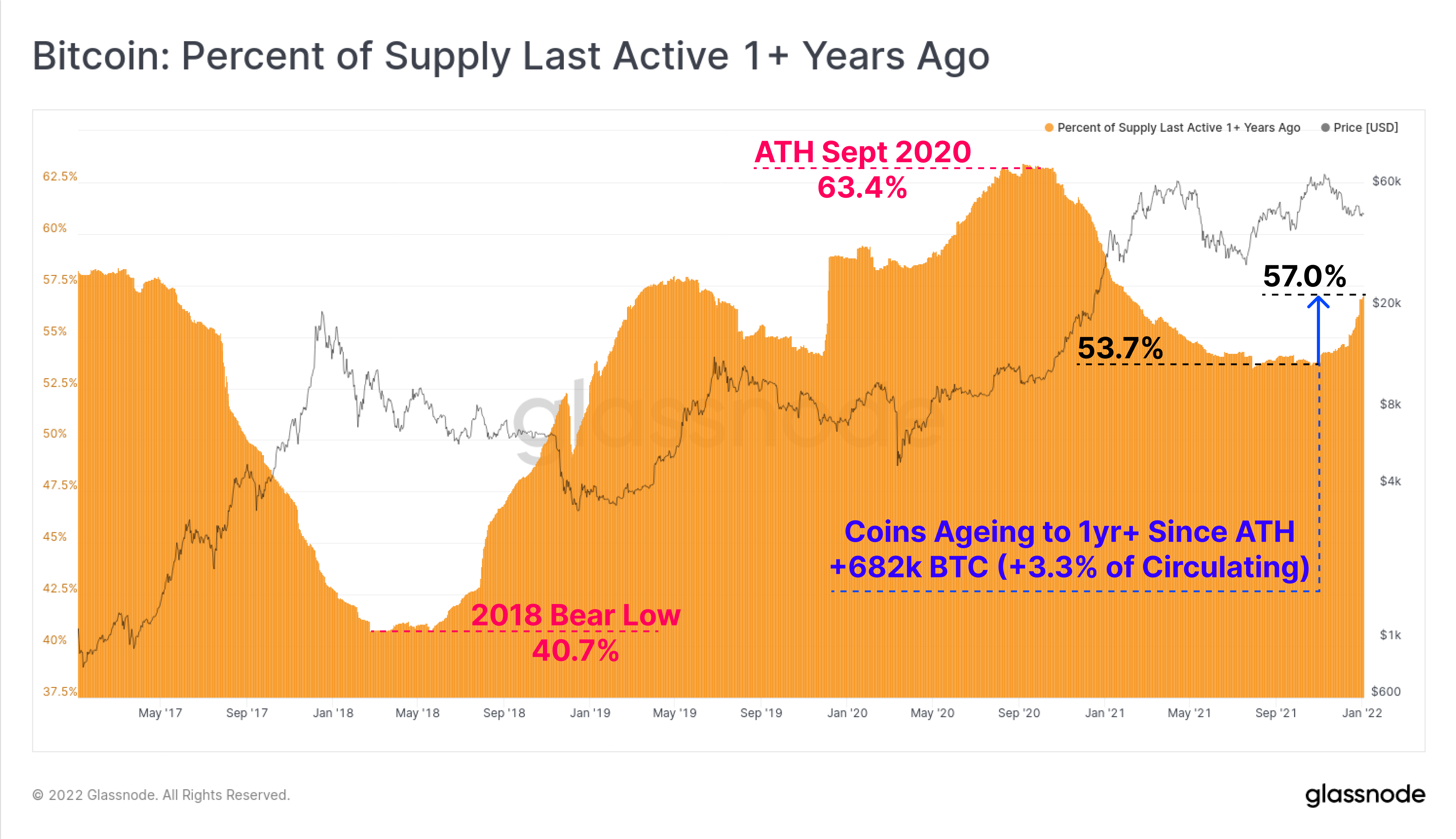 If we look at the supply last active 1y+ metric, we can see that a great proportion of coins accumulated in late 2020 remain unspent to this day. Since October 2021, over 682k BTC have migrated into the 1yr+ age band, representing 3.3% of the circulating coin supply. Over 57% of the coin supply is now older than 1yr, equivalent to the 51.5% seen at the time of the April 2019 bullish impulse.