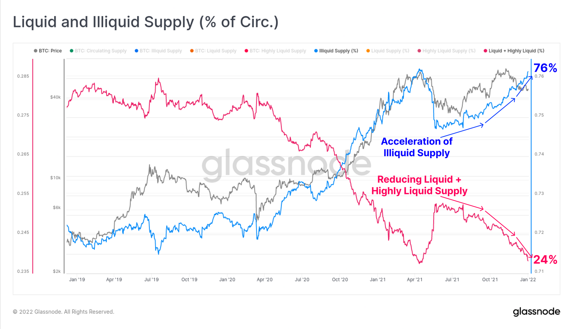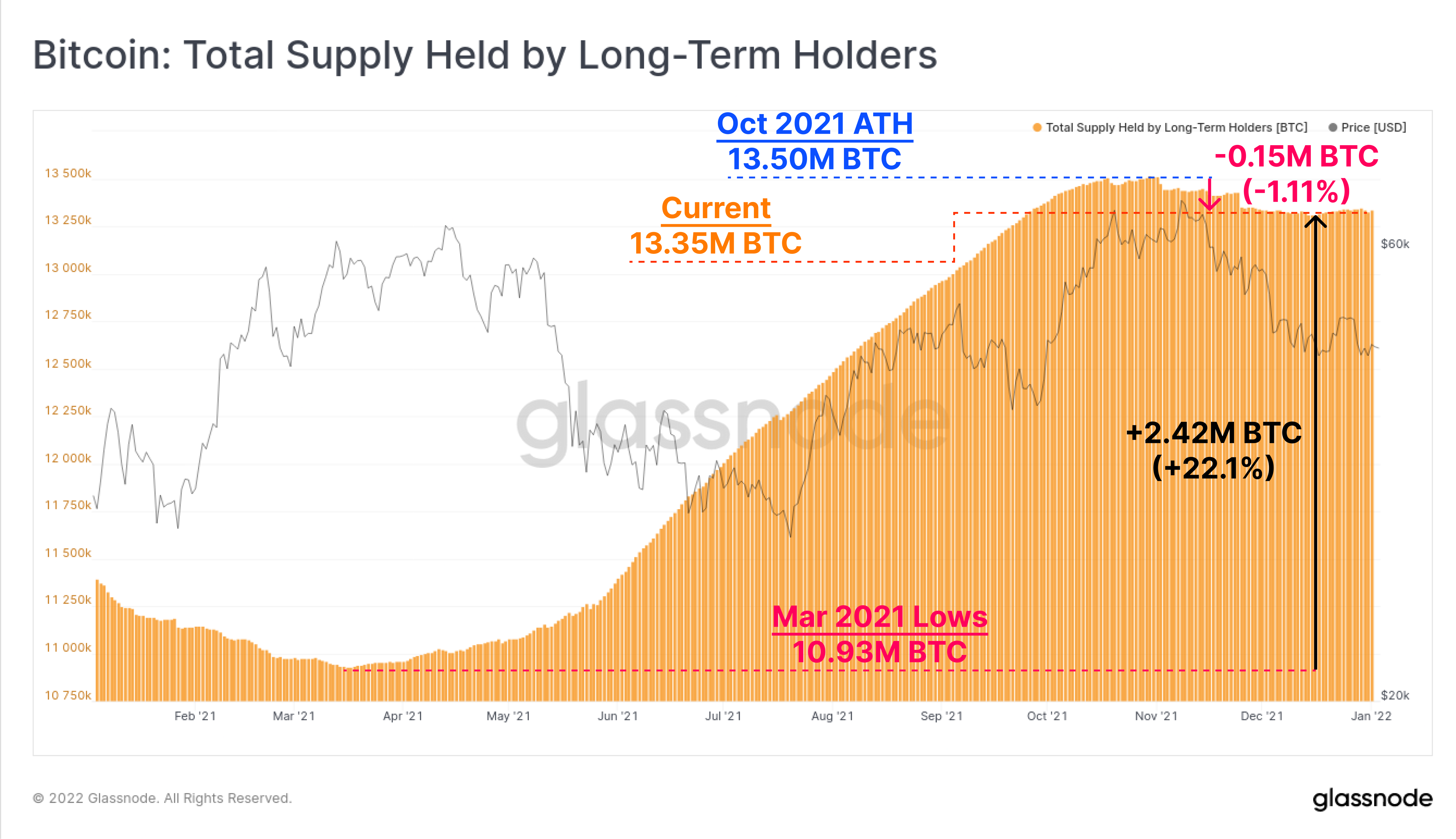 Given how volatile 2021 was, seeing such an acceleration and large proportion of coins held throughout is quite remarkable.
