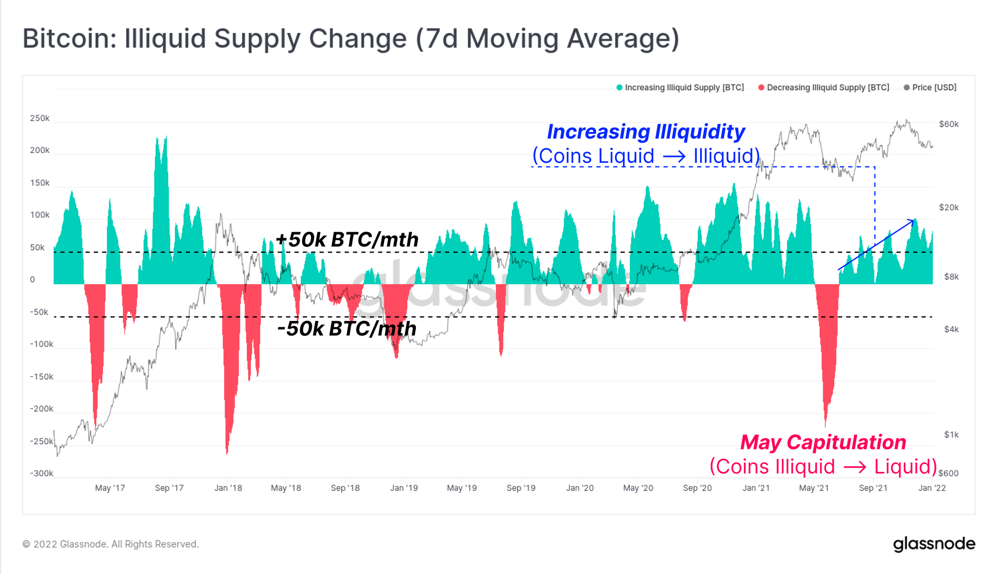 We can see below that over the final months of 2021, even as prices corrected, there has been an acceleration of coins from Liquid, into Illiquid wallets. Through December, coins moved to increasingly illiquid wallets at a rate of between 50k and 100k BTC/month reflecting a higher likelihood of broader accumulation.