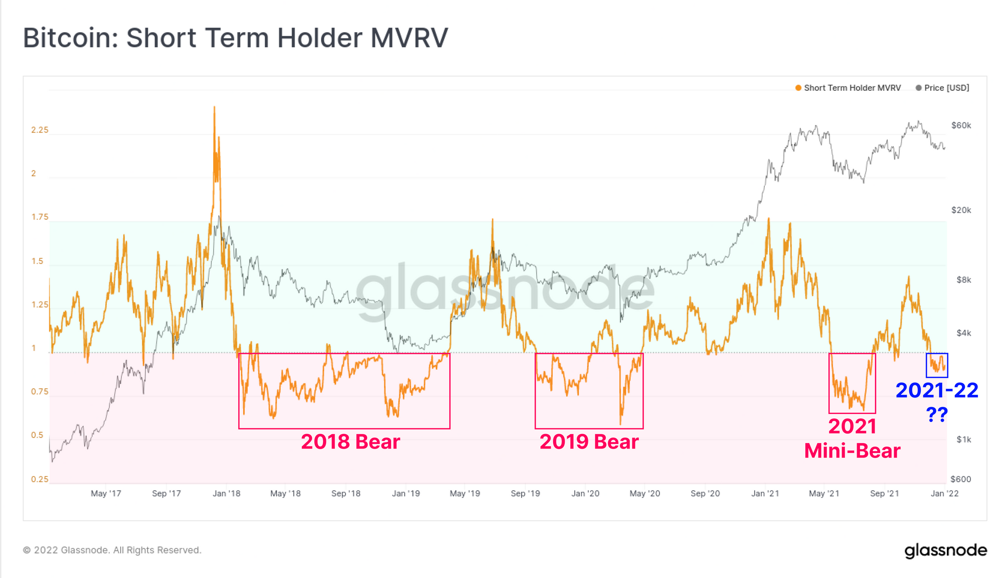 For the Short-Term Holder cohort, the STH-MVRV metric shows the magnitude of current underwater pain relative to past bearish periods. The STH-MVRV is currently trading below 1.0, an event which unfortunately has very few periods since 2017 of being a short lived event. The bearish periods in 2018, 2019 and mid-2021 all saw STHs persistently underwater, with STH-MVRV values of 1 acting as resistance.