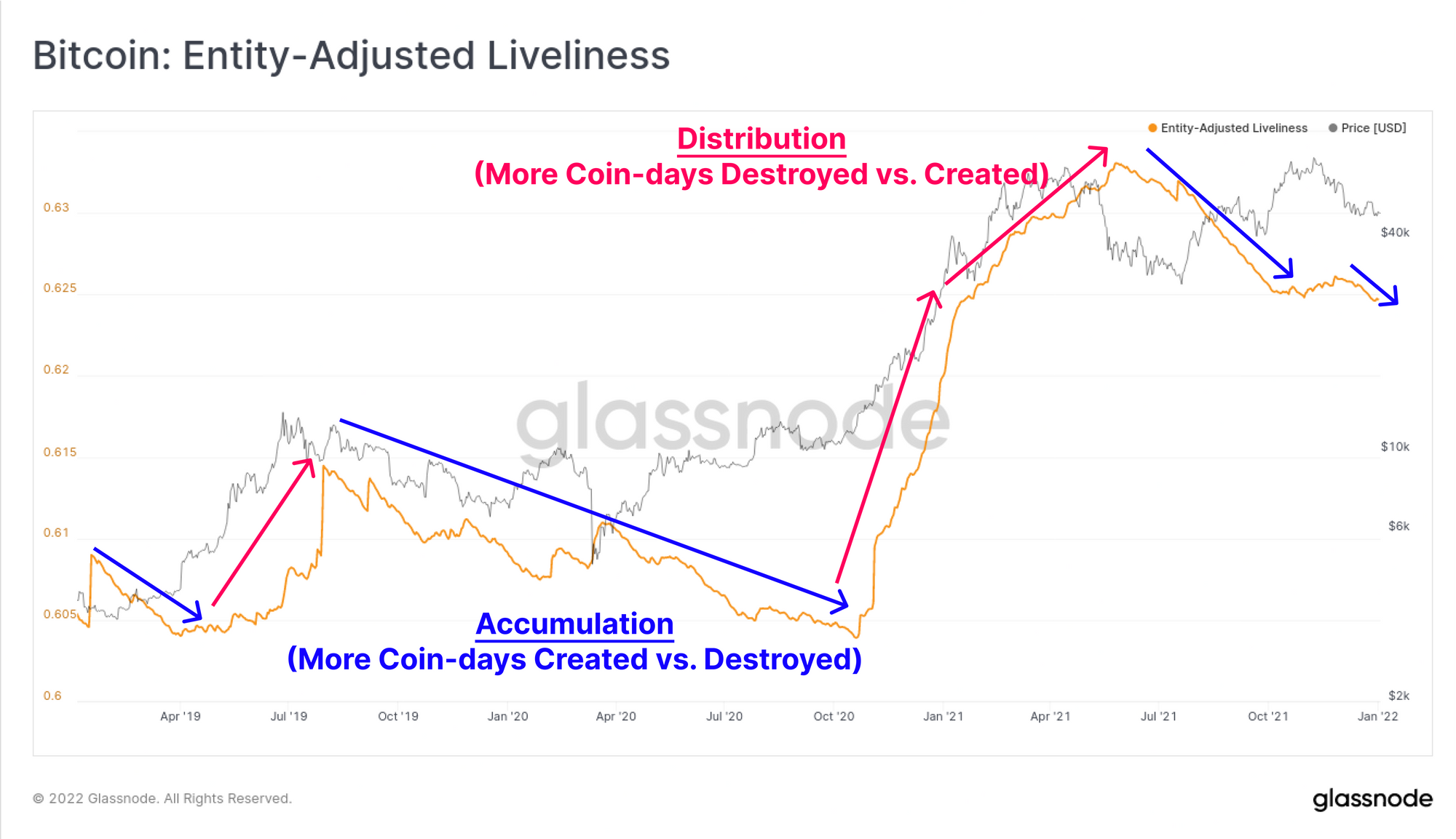 Lastly on the longer-term macro trends, we can see confluence within the Liveliness metric. Liveliness reflects the relative growth of coin-day creation, and coin-days destroyed in the circulating coin supply. Where more coin-days are created, there is more dormancy and HODLing, and Liveliness will trend lower (blue). Conversely, distribution, particularly by older hands, will see more coin-days destroyed than created and Liveliness will trend higher (pink).