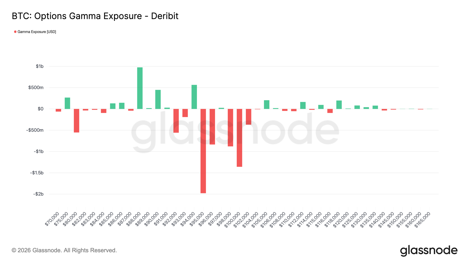 In this range, rising prices require dealers to buy spot or perpetuals to hedge, which can mechanically reinforce upside moves during periods of strength. This stands in contrast to the long-gamma conditions that prevailed into year-end.