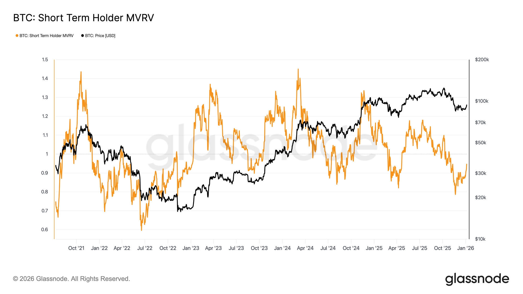This dynamic is clearly reflected in the Short-Term Holder MVRV metric, which compares spot price to the cost basis of recent buyers. Historically, sustained trading below the cost basis keeps STH-MVRV under 1, a regime where bears retain control. Currently, STH-MVRV has rebounded from a low of 0.79 to 0.95, indicating that recent investors remain at an average unrealized loss of approximately 5%. Without a decisive and sustained return to profitability, STH-MVRV > 1, the probability of further bear market continuation increases, making this a critical metric to monitor in the weeks ahead.