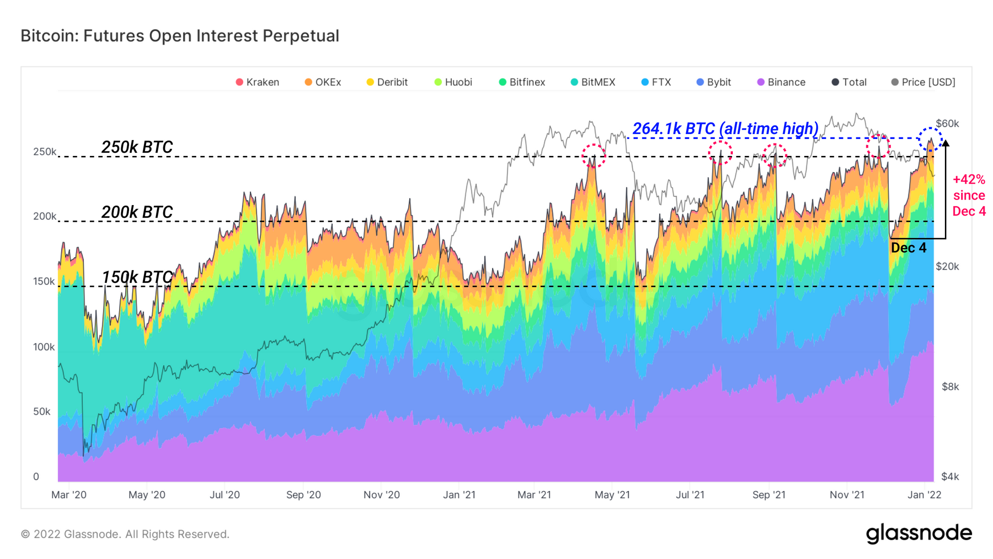 Leading our assessment of derivatives is the growth of Futures Perpetual Open Interest, which is the sum value of all open contracts in the continuous contracts market. Shown here in BTC terms, Perpetual Open Interest has reached new all-time highs of 264k BTC in the face of recent price declines, rising +42% since December 4 and surpassing the previous high of 258k BTC set on November 26.