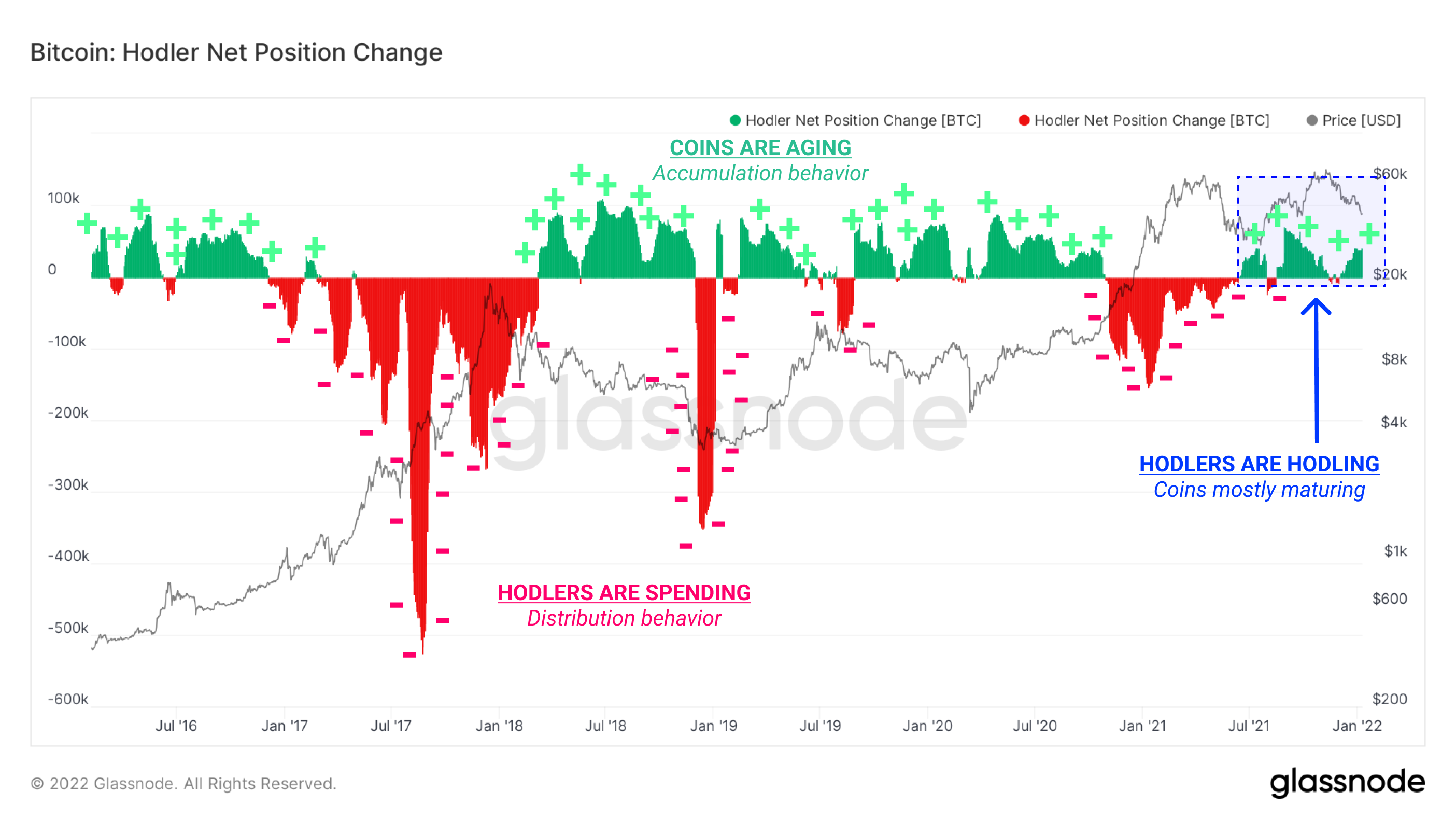 A phase of heavy loss realization by top buyers has followed the December 4 flush-out, as we first reported in our Week 50 2021 newsletter. In the weeks since, onchain behavior has been more heavily dominated by the HODLer class, with little activity by newer market entrants.