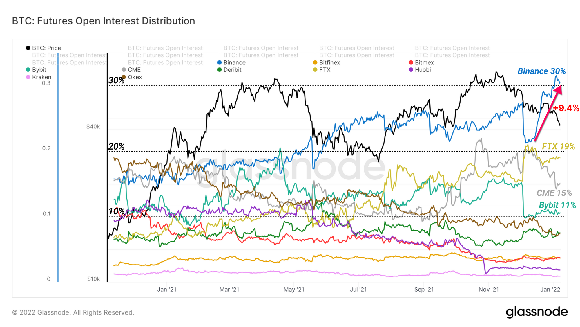 Leading the rapid growth of futures speculation are users on Binance, far and away the largest Bitcoin futures exchange by volume and size. Since May 2021, Binance has enjoyed the lion's share of Futures Open Interest among all exchanges, with a notable increase in market share during recent weeks. Since the dramatic purge on December 4th, Binance has absorbed 9.4% of Bitcoin's Futures Open Interest, and now dominates with a 30% market share.