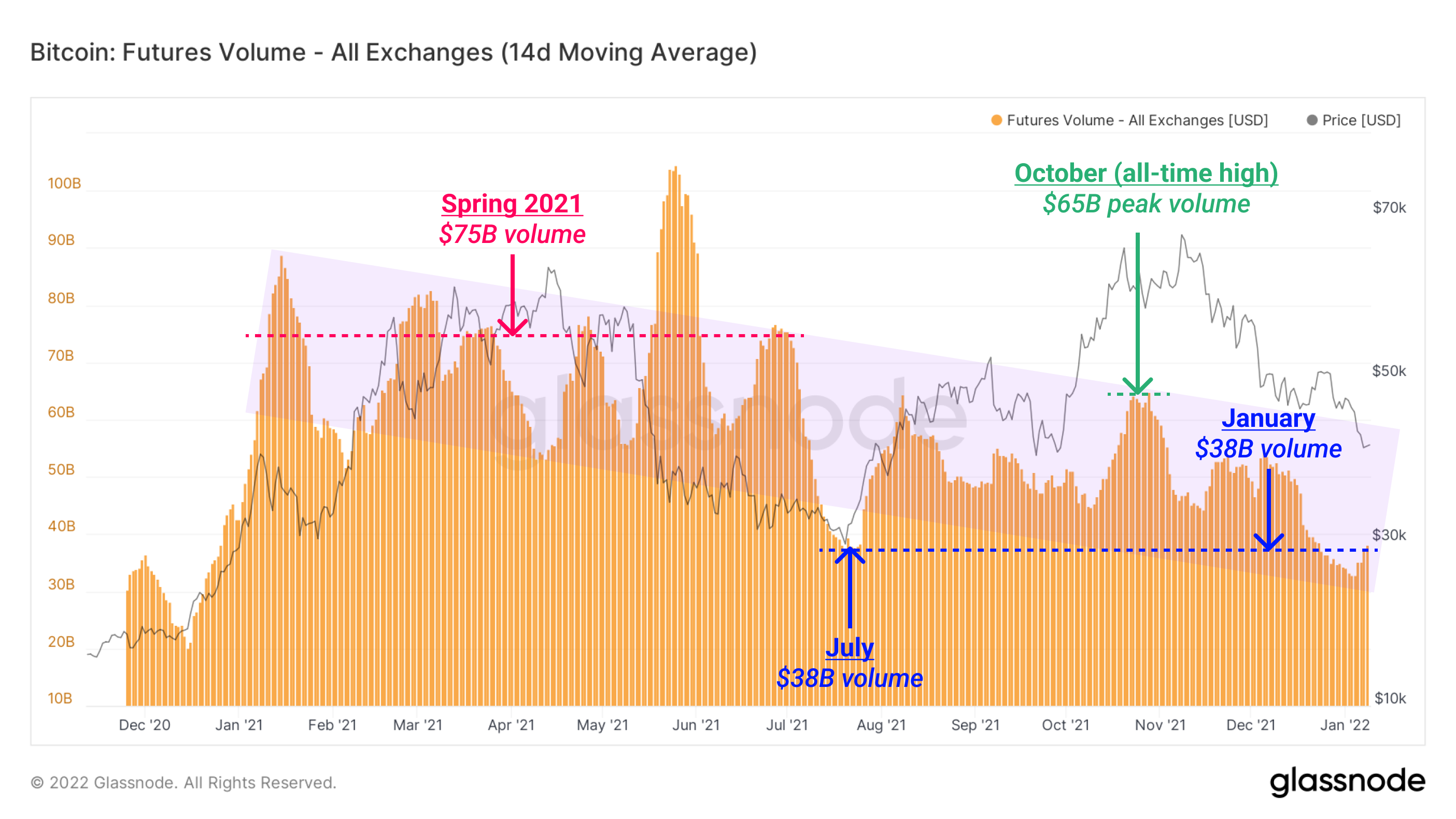 Futures Volume saw its zenith in the first half of 2021, where daily trading exceeded $75 billion/day for weeks at a time. Following the market decline of 50% into July, the October rally to all-time highs was supported by volume back up around $65 billion/day.