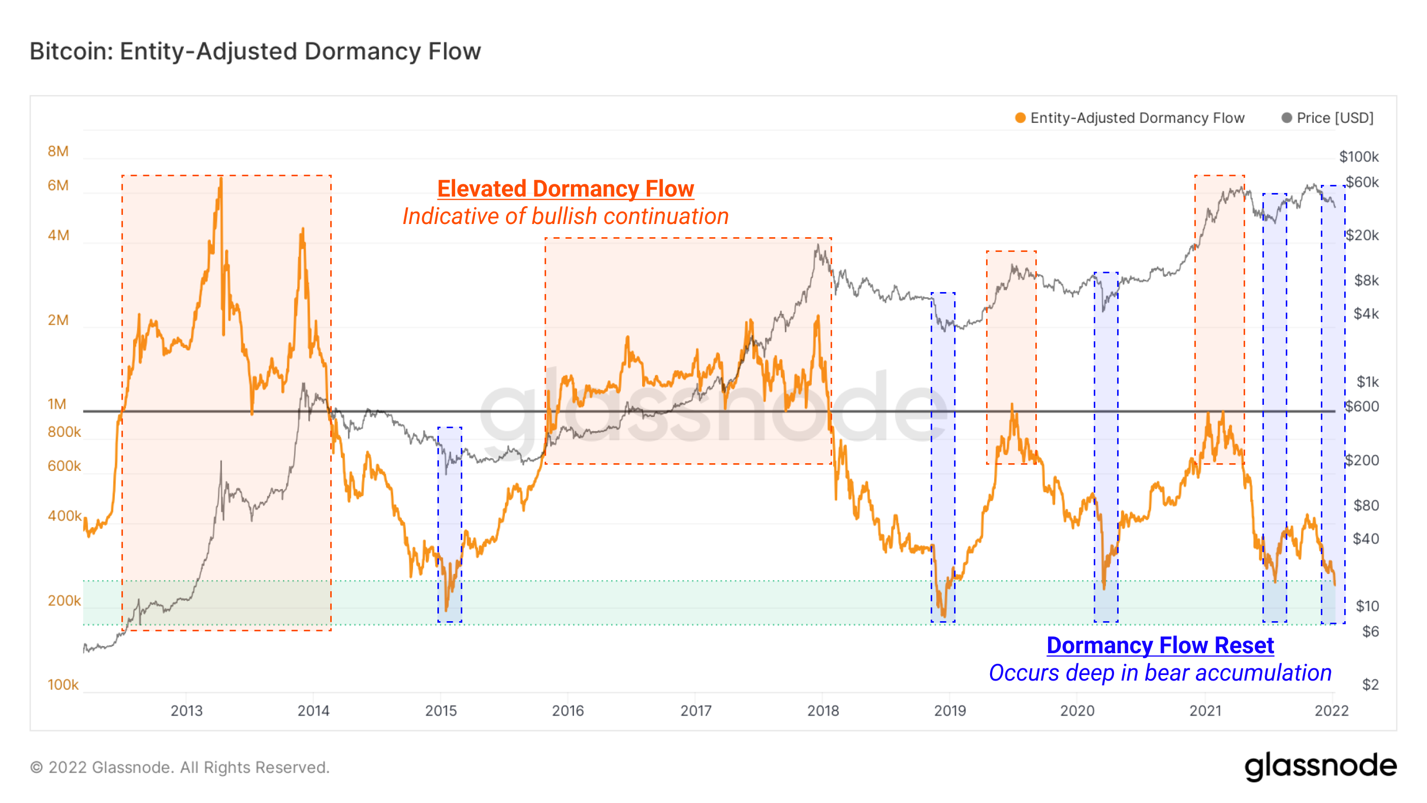 - Low Dormancy Flow values indicate moments where market cap is undervalued relative to the yearly sum of realized Dormancy, indicating moments where Bitcoin is a value price.