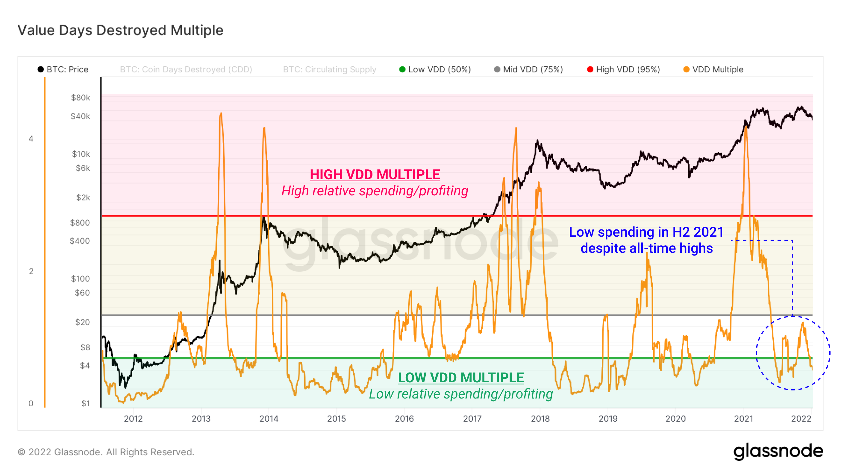 Another method for measuring spending velocity is via the Value Days Destroyed Multiple (VDD), which compares the monthly sum value of coin destruction to the yearly average.