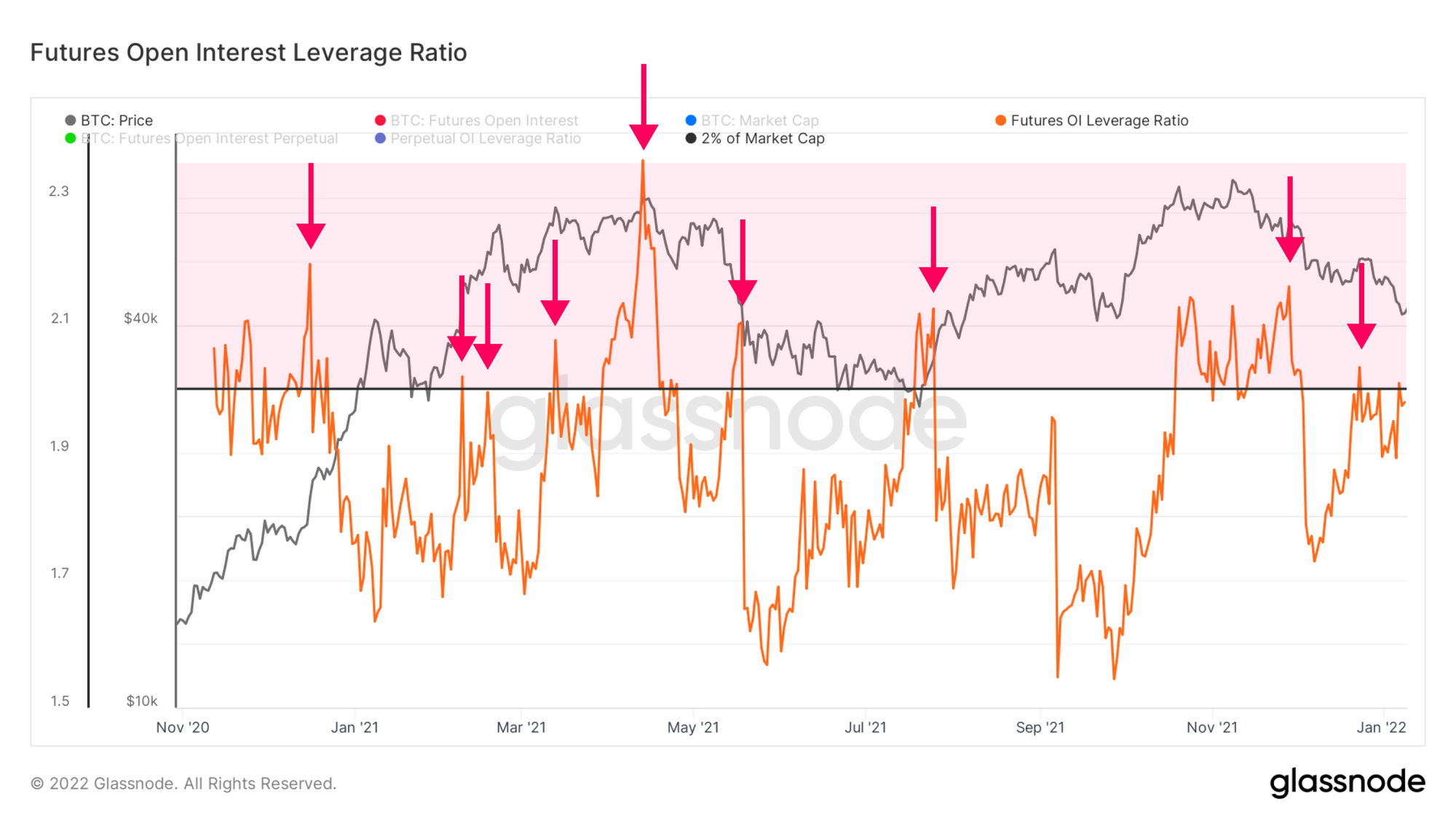 The dramatic leap in Futures Open Interest can be viewed in another way: representing itself as a leverage ratio against the Market Cap. Typically, periods where Futures Open Interest exceeds >= 2% of Market Cap are short-lived, and tend to end with a dramatic flush of margin.