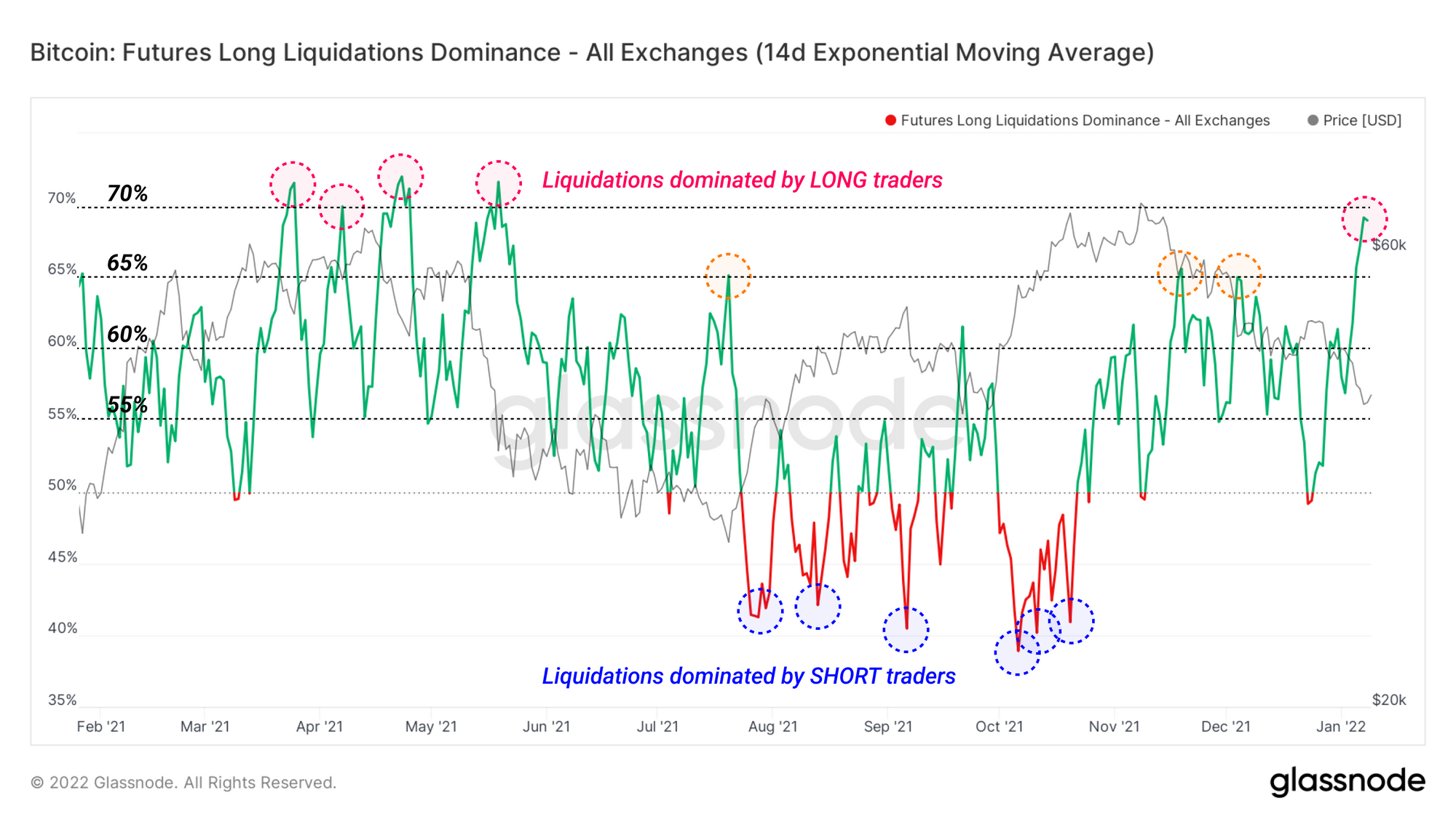 A byproduct of consistent downtrends in price are the liquidation of confident long traders trying to catch a falling knife. A great way to view the trend of liquidations is via the dominance oscillator between long and short liquidations.