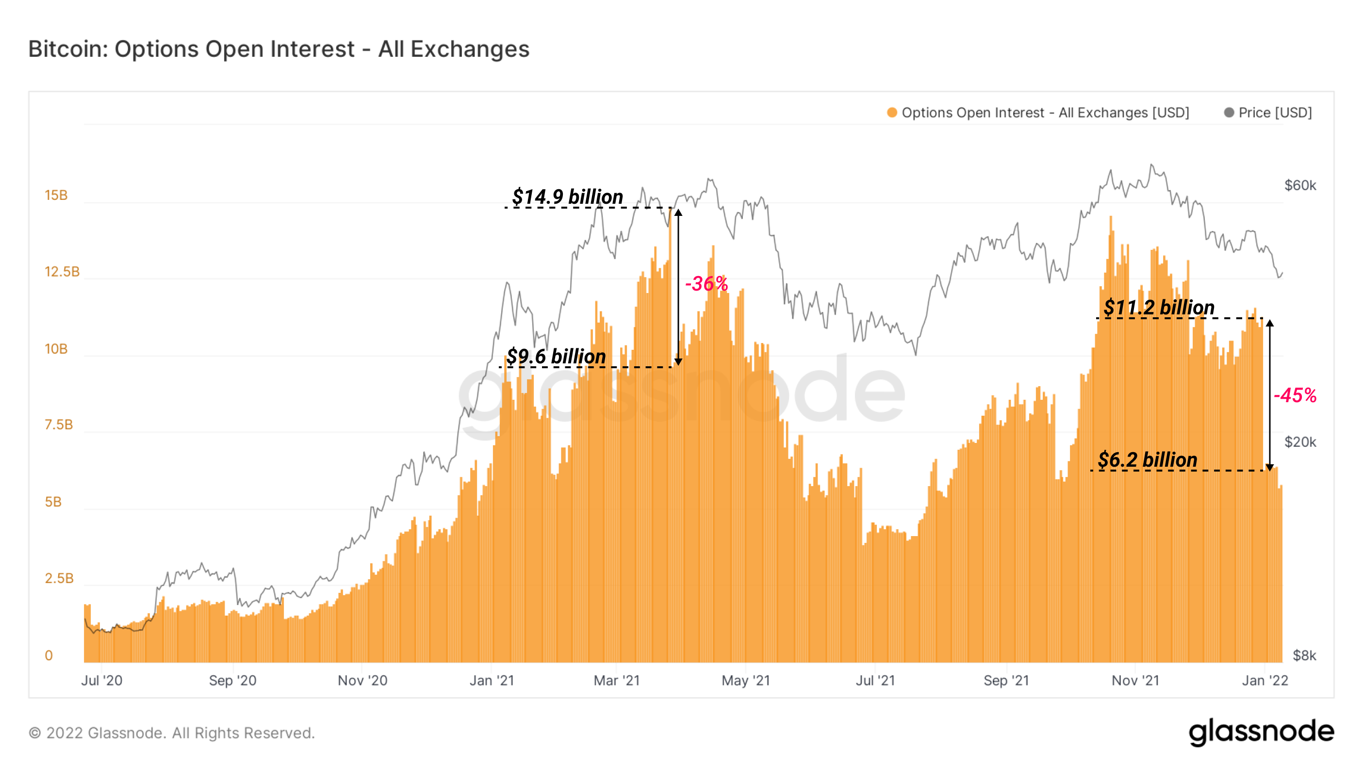 By January 1, Options Open Interest was down to $6.2 billion from a December 31 value of $11.2 billion, a haircut of -45% ($5B). The end-of-year strike was the largest of 2021 in percentage closures, but only the second in total dollars. The March 26 strike saw a record $5.3 billion closed at expiration, a reduction of -36%.
