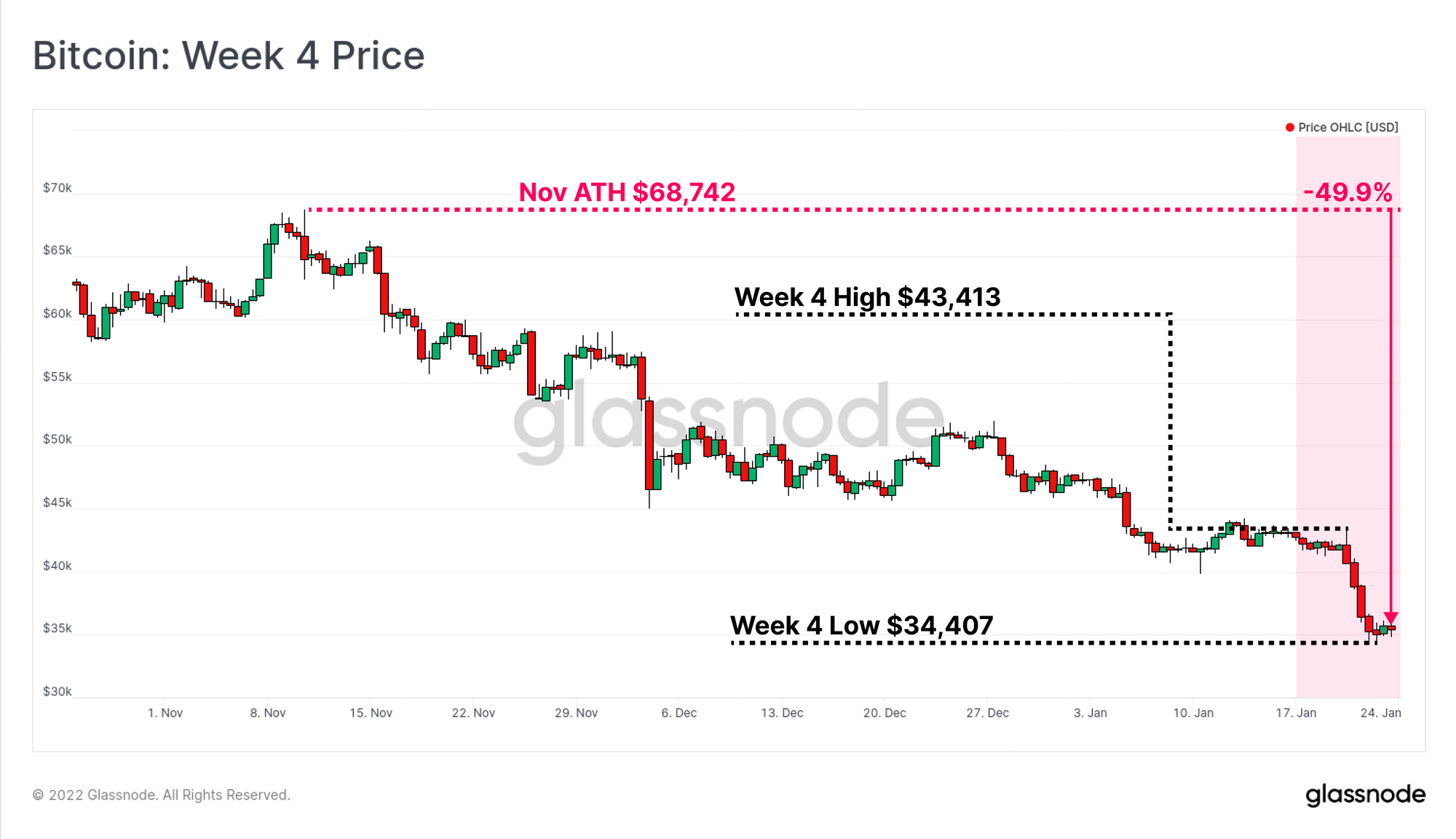The Bitcoin market has had yet another challenging week, with prices declining from the weekly open of $43,413, down to a new local low of $34,407. This puts the total drawdown relative to the November ATH at 49.9%.